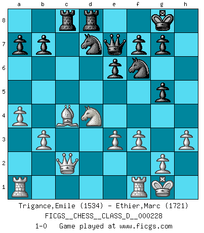 Last move : 1-0 2016 June 29 12:20:15 [Event "FICGS__CHESS__CLASS_D__000228"] [Site "FICGS"] [Date "2016.02.06"] [Round "1"] [White "Trigance,Emile"] [Black "Ethier,Marc"] [Result "1-0"] [WhiteElo "1534"] [BlackElo "1721"] 1.d4 d5 2.c4 c6 3.Nf3 Nf6 4.Nc3 dxc4 5.a4 Bf5 6.e3 e6 7.Bxc4 Bb4 8.O-O Nbd7 9.Nh4 Bg6 10.h3 O-O 11.Nxg6 hxg6 12.Qc2 Qe7 13.Bd2 Rfd8 14.Ne2 Bxd2 15.Qxd2 c5 16.Qc2 Rac8 17.b3 g5 18.f3 cxd4 19.Nxd4 1-0 This chess game has been lost on time (started : 2016.02.06 22:36:11) QGD Slav : Dutch variation Kingside Castling by player White (move 8) Kingside Castling by player Black (move 10) Player White won this chess game. Follow this game move after move (download)It was clear to me that the vulnerable point of the American Grandmaster (Bobby Fischer) was in double-edged, hanging, irrational positions, where he often failed to find a win even in a won position. (Efim Geller) Es macht mich traurig, wenn ich sehe, dass Golfprofis mehr verdienen als Schachsportler. Obwohl ich davon überzeugt bin, dass wir Schachspieler viel härter trainieren müssen als die Golfer. (Alexandra Kosteniuk) El sobresalir en el Ajedrez es un signo de una mente intrigante. (Sir Arthur Conan Doyle) Les échecs c'est le défi de l'alpiniste, toujours plus haut, prêt à tout pour monter à l'assaut du Roi ennemi. Les échecs, c'est de la musique en mouvement, un ballet majestueux pour les yeux. C'est de la poésie composée par les fantômes du passé qui au même titre que Rimbaud ou Verlaine méritent notre admiration. Les échecs, c'est de la peinture ou le moindre mouvement modifie le tableau pour en faire un Picasso ou un Van Gogh. Les échecs, c'est tout et rien, c'est la vie et la mort. Jjulie33 sur le forum de France-Echecs. To err is human, to shift the blame on someone else is tactical. (Mladen Jankovic)