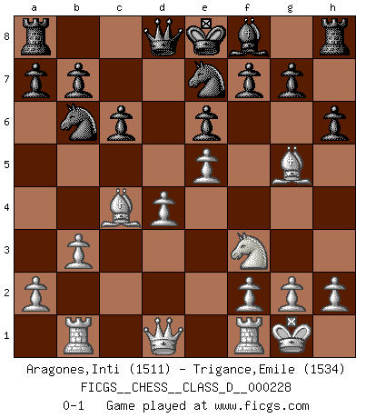 Last move : 0-1 2016 April 20 10:3:14 [Event "FICGS__CHESS__CLASS_D__000228"] [Site "FICGS"] [Date "2016.02.06"] [Round "1"] [White "Aragones,Inti"] [Black "Trigance,Emile"] [Result "0-1"] [WhiteElo "1511"] [BlackElo "1534"] 1.e4 c6 2.d4 d5 3.e5 Bf5 4.Nf3 e6 5.c4 Bxb1 6.Rxb1 dxc4 7.Bxc4 Nd7 8.O-O Nb6 9.b3 Ne7 10.Bg5 h6 0-1 Caro-Kann : Advance variation Kingside Castling by player White (move 8) Player Black won this chess game. Follow this game move after move (download)Some part of a mistake is always correct. (Savielly Tartakover) Schach sollte überall auf der Welt Schulfach werden. Es fördert die geistige Auseinandersetzung. Es lehrt die Demut in der Niederlage. (Garry Kasparov) El jugador táctico debe saber que hacer cuando algo se debe de hacer. El estratégico debe saber que hacer cuando nada se debe de hacer. (Savielly Tartakover) Les Echecs sont affaire de jugement sensible. Savoir quand frapper et quand esquiver. (Fischer) All the biggest technological inventions created by man - the airplane, the automobile, the computer - says little about his intelligence, but speaks volumes about his laziness. (Mark Kennedy)