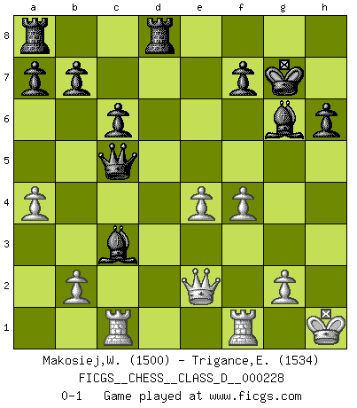 Last move : 0-1 2016 August 9 6:47:35 [Event "FICGS__CHESS__CLASS_D__000228"] [Site "FICGS"] [Date "2016.02.06"] [Round "1"] [White "Makosiej,Wladyslaw"] [Black "Trigance,Emile"] [Result "0-1"] [WhiteElo "1500"] [BlackElo "1534"] 1.d4 d5 2.c4 c6 3.Nf3 Nf6 4.Nc3 dxc4 5.a4 Bf5 6.Ne5 e6 7.Bg5 Bb4 8.e3 Nbd7 9.Nxc4 h6 10.Bh4 g5 11.Bg3 Ne4 12.Rc1 Nxg3 13.hxg3 Qe7 14.Be2 Kf8 15.O-O Kg7 16.e4 Bg6 17.d5 Rhd8 18.Bh5 Bxh5 19.Qc2 Bg6 20.dxe6 Qxe6 21.Qe2 Ne5 22.Nxe5 Qxe5 23.f4 Qc5+ 24.Kh1 gxf4 25.gxf4 Bxc3 0-1 This chess game has been lost on time (started : 2016.02.06 22:36:11) QGD Slav : Wiesbaden variation Kingside Castling by player White (move 15) Player Black won this chess game. Follow this game move after move (download)If cunning alone were needed to excel, women would be the best Chess players. (Albin) Es gibt nur zwei wahre Schachgenies - das andere war Wilhelm Steinitz, der Weltmeister von 1872 bis 1894. (Robert James Fischer) Hasta este punto, las blancas han seguido un análisis bien conocido. Pero ahora el hace un error fatal: empieza a usar su propia cabeza. (Siegbert Tarrasch) Les échecs sont un jeu par leur forme, un art par leur essence et une science par sa difficulté d'acquisition. Ils peuvent vous procurer autant de plaisir qu'un bon livre ou une belle musique, mais vous n'aurez une réelle joie que si vous arrivez à bien jouer. (Tigran Petrosian) You know what they say : You lie down with the Devil, you wake up in Hell. (Horatio Caine, C.S.I. Miami)