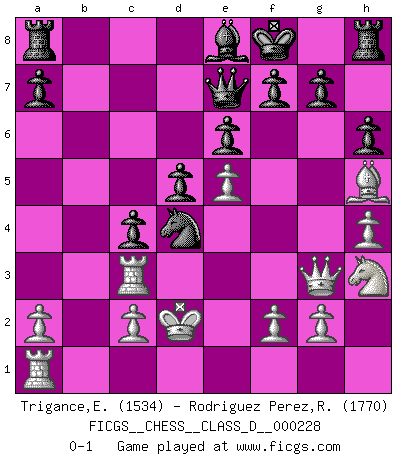 Last move : 0-1 2016 March 11 6:58:26 [Event "FICGS__CHESS__CLASS_D__000228"] [Site "FICGS"] [Date "2016.02.06"] [Round "1"] [White "Trigance,Emile"] [Black "Rodriguez Perez,Rene"] [Result "0-1"] [WhiteElo "1534"] [BlackElo "1770"] 1.d4 e6 2.e4 d5 3.Nc3 Nf6 4.Bg5 Bb4 5.e5 h6 6.Bd2 Bxc3 7.bxc3 Ne4 8.Qg4 Kf8 9.h4 c5 10.Rh3 Nc6 11.Bd3 Nxd2 12.Kxd2 c4 13.Be2 b5 14.Qf4 Bd7 15.Bh5 Be8 16.Rf3 Qe7 17.Nh3 b4 18.Qg3 bxc3+ 19.Rxc3 Nxd4 0-1 Queen's pawn Player Black won this chess game. Follow this game move after move (download)My God, Bobby Fischer plays so simply. (Alexei Suetin) Ich verachte Kasparow. (Viktor Kortschnoi) Un Peón pasado es un criminal, quién debe ser mantenido bajo candado y llave. Leves medidas, tales como vigilancia policiaca, no son suficientes. (Aaron Nimzovich) Le génie consiste à savoir transgresser les règles au moment opportun. (Teichmann) I've lost money so fast in these clubs it's left me reeling. I've read every poker book ever written, but the only way to get better at the game is to go out and play with people who are really good. The problem is, you stand to lose a lot of money doing it. (Matt Damon)