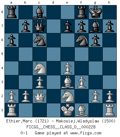 Last move : 0-1 2016 July 18 14:14:58 [Event "FICGS__CHESS__CLASS_D__000228"] [Site "FICGS"] [Date "2016.02.06"] [Round "1"] [White "Ethier,Marc"] [Black "Makosiej,Wladyslaw"] [Result "0-1"] [WhiteElo "1721"] [BlackElo "1500"] 1.e4 g6 2.d4 Bg7 3.c3 c5 4.dxc5 Qc7 5.Be3 Nf6 6.Nd2 O-O 7.f3 Nc6 8.Ne2 d6 9.cxd6 Qxd6 10.Qc2 a6 11.Nc4 Qc7 0-1 This chess game has been lost on time (started : 2016.02.06 22:36:11) Robatsch (Modern) defense Kingside Castling by player Black (move 6) Player Black won this chess game. Follow this game move after move (download)I still hope to kill Fischer. (Boris Spassky) Immer nach dem besten Zug zu suchen ist ziemlich unpraktisch. (Nigel Short) El Ajedrez es en su esencia, un juego. En su forma, un arte. Y en su ejecución, una ciencia. (Baron Tassilo) Si rien de grave n'est détecté lors de l'analyse d'une position, on joue alors le coup. Seconde règle de Blumenfeld. Beta. Software undergoes beta testing shortly before it's released. Beta is latin for still doesn't work. (Anonymous)