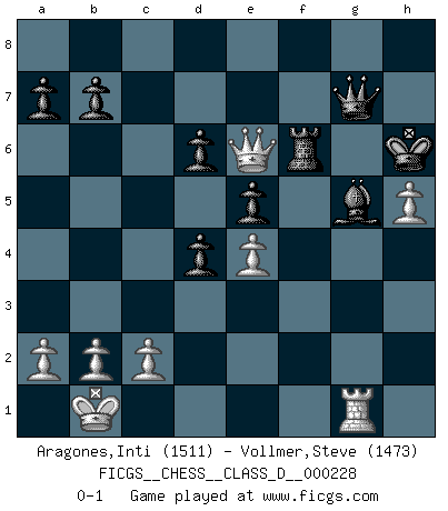 Last move : 0-1 2016 April 20 10:3:14 [Event "FICGS__CHESS__CLASS_D__000228"] [Site "FICGS"] [Date "2016.02.06"] [Round "1"] [White "Aragones,Inti"] [Black "Vollmer,Steve"] [Result "0-1"] [WhiteElo "1511"] [BlackElo "1473"] 1.e4 d6 2.d4 Nf6 3.Nc3 g6 4.Bg5 Bg7 5.Qd2 Nc6 6.Nf3 O-O 7.Be2 Bg4 8.h3 Bxf3 9.Bxf3 e5 10.d5 Nd4 11.O-O-O c6 12.Ne2 Nxe2+ 13.Qxe2 Qc7 14.h4 h5 15.g4 cxd5 16.Bxf6 Bxf6 17.gxh5 d4 18.hxg6 fxg6 19.Rhg1 Kh7 20.Bh5 Rg8 21.Bxg6+ Rxg6 22.Rxg6 Kxg6 23.Rg1+ Kh6 24.h5 Bg5+ 25.Kb1 Rf8 26.Qg4 Qg7 27.Qe6+ Rf6 28.Qh3 Rxf2 29.Qe6+ Rf6 0-1 Pirc : Byrne variation Kingside Castling by player Black (move 6) Queenside Castling by player White (move 11) Player Black won this chess game. Follow this game move after move (download)I thought the most common mistake [in chess] was the first one: Learning the game :P (Garvin Gray, FICGS forum) Ich habe die Schachforschung dermaßen betrieben, dass sie auf eine wissenschaftliche Basis gestellt wurde. (Mikhail Moiseyevich Botvinik) El Ajedrez es un cuento de Hadas de las 1001 metidas de pata. (Savielly Tartakower) J'ai vu le vaincu d'Echecs jouer des années durant dans l'espoir de la fête de la victoire. Car tu es plus riche de ce qu'elle existe si même elle n'est point pour toi. Ainsi de la perle du fond des mers. (Antoine de Saint-Exupéry) Hardware: the parts of a computer that can be kicked. (Jeff Persis)