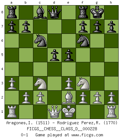 Last move : 0-1 2016 March 29 20:33:9 [Event "FICGS__CHESS__CLASS_D__000228"] [Site "FICGS"] [Date "2016.02.06"] [Round "1"] [White "Aragones,Inti"] [Black "Rodriguez Perez,Rene"] [Result "0-1"] [WhiteElo "1511"] [BlackElo "1770"] 1.d4 d5 2.Nf3 e6 3.Bf4 Nf6 4.Nc3 Nc6 5.a3 Bd6 6.Bxd6 cxd6 7.e3 O-O 8.Be2 e5 9.dxe5 dxe5 0-1 This chess game has been lost on time (started : 2016.02.06 22:36:11) Queen's pawn game Kingside Castling by player Black (move 7) Player Black won this chess game. Follow this game move after move (download)When the Chess game is over, the Pawn and the King go back to the same box. (Irish saying) Ich bewundere Kasparows phantasievolle Angriffssiege aus den Achtzigern und Neunzigern, aber wenn man sie mit dem Computer überprüft, nimmt der Computer in jeder zweiten Partie die Opfer an, verteidigt sich und gewinnt. (Vladimir Kramnik) El Rey es una pieza de pelea. ¡Usenlo!. (Wilhelm Steinitz) Je ne suis pas le dernier à jouer lâchement des coups douteux pendant le zeïtnot de l'adversaire pour l'achever: en effet les coups qui font le plus peur sont ceux que l'on ne comprend pas. Je me fais souvent peur quand je joue. (Un professeur anonyme) They say in chess you've got to kill the queen, and then you mate it... Oh I, do you ? (Red Hot Chili Peppers, Fortune faded)