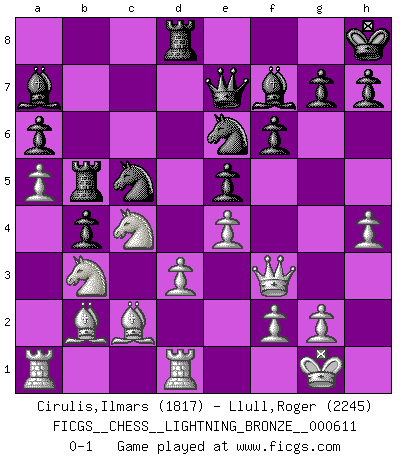 Last move : 0-1 2016 February 7 1:33:7 [Event "FICGS__CHESS__LIGHTNING_BRONZE__000611"] [Site "FICGS"] [Date "2016.02.07"] [Round "1"] [White "Cirulis,Ilmars"] [Black "Llull,Roger"] [Result "0-1"] [WhiteElo "1817"] [BlackElo "2245"] 1.b4 e5 2.a3 d5 3.e3 Nf6 4.Bb2 Nbd7 5.c4 dxc4 6.Bxc4 Bd6 7.d3 O-O 8.Nd2 a6 9.Ngf3 b5 10.Bb3 c5 11.bxc5 Nxc5 12.Bc2 Bf5 13.e4 Bg6 14.O-O Re8 15.a4 b4 16.h3 Nfd7 17.a5 Rb8 18.Nc4 Bc7 19.Nfd2 Kh8 20.Qf3 f6 21.Rfc1 Rb5 22.h4 Bf7 23.Nb3 Bb8 24.Ncd2 Ne6 25.Nc4 Ndc5 26.Rd1 Qe7 27.Ncd2 Rd8 28.Nc4 Ba7 0-1 Comment by player 1 : Ilmars Cirulis : Would you agree that 7.d3 was the first mistake? It allowed very nice pawn majority movement (as in the game) because c5 was left weak. The correct move was 7.d4. About the game after seventh move I can't say a lot - my defense was bad but the result was already known, imo. Polish (Sokolsky) opening Kingside Castling by player Black (move 7) Kingside Castling by player White (move 14) Player Black won this chess game. Follow this game move after move (download)Human affairs are like a Chess game: only those who do not take it seriously can be called good players. (Hung Tzu Ch'eng) Matt entspricht nicht immer den Tatsachen. (Savielly Grigorievitsch Tartakower) Una victoria por una combinación errónea, aunque sea espectacular, me llena de horror artístico. (Wilhelm Steinitz) Dieu déplace le joueur, et celui-ci la pièce. Quel Dieu derrière Dieu commence donc la trame ? Arturo Perez-Reverte (prix de littérature policière 1993). Only sick music makes money today. (Friedrich Nietzsche)