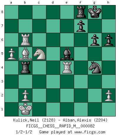 Last move : 1/2-1/2 2016 February 25 0:52:42 [Event "FICGS__CHESS__RAPID_M__000082"] [Site "FICGS"] [Date "2016.02.08"] [Round "1"] [White "Kulick,Neil"] [Black "Alban,Alexis"] [Result "1/2-1/2"] [WhiteElo "2128"] [BlackElo "2204"] 1.e4 c5 2.Nf3 d6 3.d4 cxd4 4.Nxd4 Nf6 5.Nc3 h6 6.Be3 a6 7.f3 e5 8.Nb3 Be6 9.Qd2 Nbd7 10.g4 b5 11.a4 b4 12.Nd5 Bxd5 13.exd5 Nb6 14.Bxb6 Qxb6 15.O-O-O g6 16.a5 Qb7 17.f4 Bg7 18.fxe5 dxe5 19.Nc5 Qa7 20.Nxa6 O-O 21.Qxb4 Qe3+ 22.Kb1 Nxd5 23.Qb3 Qxb3 24.cxb3 Ne3 25.Rd6 e4 26.Bb5 Be5 27.Rb6 Nxg4 28.b4 Rad8 29.Re1 Rd4 30.Nc5 Rxb4 31.Rxe4 1/2-1/2 Sicilian Queenside Castling by player White (move 15) Kingside Castling by player Black (move 20) This chess game ended in a draw. Follow this game move after move (download)You must take your opponent into a deep dark forest where 2+2=5, and the path leading out is only wide enough for one. (Mikhail Tal) Viele Opfer benötigen überhaupt keine konkrete Berechnung. Es genügt sich die entstehende Position kurz vorzustellen, um uns davon zu überzeugen, dass das Opfer korrekt ist. (Mikhail Nekhemyevich Tal) En partidas rápidas, el Caballo es mas poderoso que el Alfil. (Vlastimil Hort) Pour moi, les échecs ne sont pas un jeu mais un art. (Alexandre Alekhine) Difficult things take a long time, impossible things a little longer. (Author unknown)
