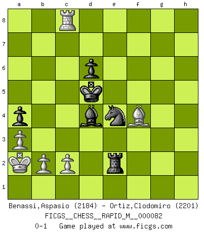 Last move : 0-1 2016 March 22 10:39:47 [Event "FICGS__CHESS__RAPID_M__000082"] [Site "FICGS"] [Date "2016.02.08"] [Round "1"] [White "Benassi,Aspasio"] [Black "Ortiz,Clodomiro"] [Result "0-1"] [WhiteElo "2184"] [BlackElo "2201"] 1.e4 e5 2.f4 exf4 3.Nf3 d6 4.Bc4 h6 5.h4 Nf6 6.Nc3 Nc6 7.d4 Nh5 8.Nd5 Ng3 9.Rh2 Ne7 10.Bxf4 Nxe4 11.Qe2 c6 12.Qxe4 cxd5 13.Bb5+ Bd7 14.Bxd7+ Qxd7 15.Qd3 O-O-O 16.O-O-O Ng8 17.g3 Nf6 18.Re2 Be7 19.Kb1 Rhe8 20.Ne1 Ne4 21.Ng2 f5 22.Be3 Nxg3 23.R2e1 Ne4 24.Qb3 g5 25.hxg5 hxg5 26.Bc1 f4 27.Qxd5 Ng3 28.Re6 Qc6 29.Qxc6+ bxc6 30.d5 cxd5 31.Nxf4 gxf4 32.Bxf4 Bh4 33.Rxe8 Rxe8 34.a3 Kc7 35.Rxd5 Re1+ 36.Ka2 Ne4 37.Rd3 Kc6 38.Rh3 Bf2 39.Rh2 Re2 40.Kb1 a5 41.Rg2 Re1+ 42.Ka2 a4 43.Rg6 Bd4 44.Rg8 Kd5 45.Rc8 Re2 0-1 KGA : Fischer defense Queenside Castling by player Black (move 15) Queenside Castling by player White (move 16) Player Black won this chess game. Follow this game move after move (download)Chess is above all, a fight ! (Emanuel Lasker) Meine Liebe ist Schach, Schach, Schach. Ich muss jeden Tag Schach spielen, deshalb fühle ich mich so stark. (Miguel Najdorf) En la perfecta combinación de Ajedrez como en una historia corta de primera clase, toda la trama y contra trama deberá conducir hacia un final sorprendente, el interes no es mitigado hasta el último momento. (Yates and Winter) Toutes choses étant égales, c'est la conviction qui gagne. Alliée à une volonté de vaincre, elle sert de détonateur, suscite des idées, disperse les doutes et aide à penser clairement. (Robert Fischer) Knowledge rests not upon truth alone, but upon error also. (Carl G. Jung)