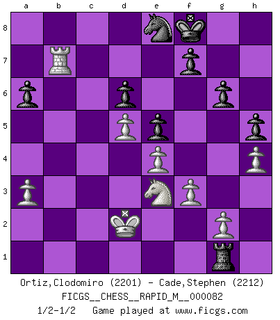 Last move : 1/2-1/2 2016 March 10 15:12:4 [Event "FICGS__CHESS__RAPID_M__000082"] [Site "FICGS"] [Date "2016.02.08"] [Round "1"] [White "Ortiz,Clodomiro"] [Black "Cade,Stephen"] [Result "1/2-1/2"] [WhiteElo "2201"] [BlackElo "2212"] 1.d4 Nf6 2.c4 g6 3.Nc3 Bg7 4.e4 d6 5.Bd3 O-O 6.Nge2 Nc6 7.O-O e5 8.d5 Nd4 9.Bg5 h6 10.Be3 Ng4 11.Bd2 c5 12.f3 Nf6 13.Qc1 h5 14.Bg5 Qb6 15.Rb1 Bd7 16.Qd2 a6 17.Be3 Qa7 18.b4 cxb4 19.Rxb4 Bh6 20.Nd1 Nxe2+ 21.Qxe2 Bxe3+ 22.Qxe3 b5 23.Qxa7 Rxa7 24.Ne3 Rc8 25.Rb3 Ne8 26.Rfb1 Kf8 27.h4 bxc4 28.Nxc4 Bb5 29.Ne3 Ke7 30.Bf1 Rc5 31.Kf2 Bxf1 32.Kxf1 Ra5 33.R1b2 Rc7 34.Rb4 Rc1+ 35.Ke2 Ra1 36.Rb7+ Kf8 37.a3 Rc5 38.Rc2 Rxc2+ 39.Nxc2 Rc1 40.Ne3 Ra1 41.Nc2 Rc1 42.Kd2 Rg1 43.Ne3 1/2-1/2 King's Indian : 4.e4 Kingside Castling by player Black (move 5) Kingside Castling by player White (move 7) This chess game ended in a draw. Follow this game move after move (download)Chess is a sea in which a gnat may drink and an elephant may bathe. (Hindu proverb) Sicherlich können nur Meister einen Stil haben. Daß ein nicht-Meister auch nur ein einziges Mal in seinem Leben eine Partie folgerecht durchführte, habe ich niemals bemerkt. (Emanuel Lasker) Los problemas de Ajedrez exigen del compositor las mismas virtudes que caracterizan todo el arte de valor: originalidad, invención, concisión, armonía, complejidad e insinceridad explendida. (Vladimir Nabokov) Mais l'homme est une créature légère et illogique : semblable au joueur d'échecs, il n'aime que le processus du but à atteindre, non le but lui-même. (Dostoïevsky) No enterprise is more likely to succeed than one concealed from the enemy until it is ripe for execution. (Niccolo Machiavelli)
