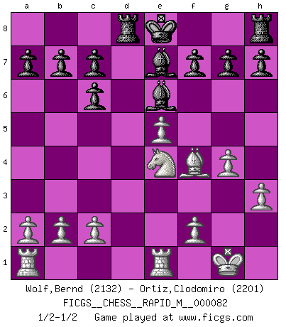 Last move : 1/2-1/2 2016 February 22 8:49:34 [Event "FICGS__CHESS__RAPID_M__000082"] [Site "FICGS"] [Date "2016.02.08"] [Round "1"] [White "Wolf,Bernd"] [Black "Ortiz,Clodomiro"] [Result "1/2-1/2"] [WhiteElo "2132"] [BlackElo "2201"] 1.e4 e5 2.Nf3 Nc6 3.Bb5 Nf6 4.O-O Nxe4 5.d4 Nd6 6.Bxc6 dxc6 7.dxe5 Nf5 8.Qxd8+ Kxd8 9.Nc3 Be7 10.h3 Ke8 11.Ne4 Nh4 12.Nxh4 Bxh4 13.Bf4 Bf5 14.Rfe1 Rd8 15.g3 Be7 16.g4 Be6 1/2-1/2 Ruy Lopez : Berlin defense, Open variation Kingside Castling by player White (move 4) This chess game ended in a draw. Follow this game move after move (download)The older I grow, the more I value pawns. (Paul Keres) Die starken Figuren des Gegners muss man abtauschen. (José Raúl Capablanca) Fischer no está bajo la obligación de nadie. (Joseph Platz) Un millionnaire : 'Monsieur Steinitz ! Vous ne participez aux tournois que pour l'argent, alors que moi je n'y viens que pour l'honneur.' Steinitz : 'Chacun joue pour ce qu'il n'a pas'... Unless I accept my faults I will most certainly doubt my virtues. (Hugh Prather)