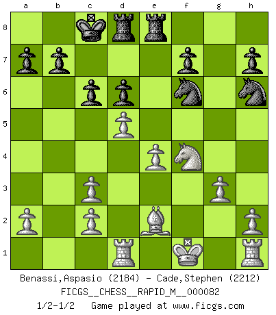 Last move : 1/2-1/2 2016 February 29 12:42:28 [Event "FICGS__CHESS__RAPID_M__000082"] [Site "FICGS"] [Date "2016.02.08"] [Round "1"] [White "Benassi,Aspasio"] [Black "Cade,Stephen"] [Result "1/2-1/2"] [WhiteElo "2184"] [BlackElo "2212"] 1.e4 e5 2.f4 exf4 3.Bc4 Qh4+ 4.Kf1 d6 5.d4 Be6 6.Qd3 Nd7 7.Nc3 c6 8.d5 Bg4 9.Bxf4 Qf6 10.Qg3 g5 11.Qxg4 gxf4 12.Nf3 Nh6 13.Qh4 Qxh4 14.Nxh4 Bg7 15.g3 Bf6 16.Be2 O-O-O 17.Rd1 Rhe8 18.Ng2 Bxc3 19.bxc3 Nf6 20.Nxf4 1/2-1/2 KGA : Bishop's gambit Queenside Castling by player Black (move 16) This chess game ended in a draw. Follow this game move after move (download)Chess is played with the mind and not with the hands ! (Renaud and Kahn) Spielt Blackmar-Diemer-Gambit, und das Matt kommt von selbst! (Emil Joseph Diemer) El jugador blanco perdió porque fallo en recordar la coreccta continuación y tuvo que pensar por sí mismo las movidas. (Siegbert Tarrasch) Les écrivains ont utilisé les échecs pour analyser les côtés extrêmes de la nature humaine. Dans ce cadre, les échecs offrent un champ d'expérimentation idéal. Mais on pourrait faire la même chose avec la peinture. Et là, en vous référant à Van Gogh, vous ne tirerez pas de conclusion définitive sur les peintres. (Gary Kasparov) If you are good, you will be assigned all the work. If you are really good, you will get out of it. (Dan Rotaru)