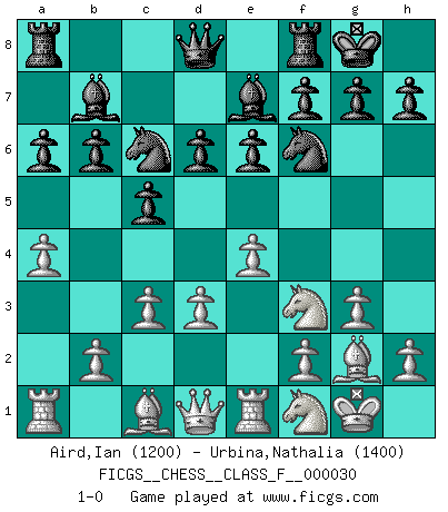 Last move : 1-0 2007 June 24 20:47:48 [Event "FICGS__CHESS__CLASS_F__000030"] [Site "FICGS"] [Date "2007.03.20"] [Round "1"] [White "Aird,Ian"] [Black "Urbina,Nathalia"] [Result "1-0"] [WhiteElo "1200"] [BlackElo "1400"] 1.e4 c5 2.Nf3 d6 3.g3 e6 4.d3 Nf6 5.Nbd2 Nc6 6.c3 Be7 7.Bg2 O-O 8.O-O a6 9.a4 b6 10.Re1 Bb7 11.Nf1 1-0 This chess game has been lost on time (started : 2007.03.20 18:5:24) Sicilian Kingside Castling by player Black (move 7) Kingside Castling by player White (move 8) Player White won this chess game. Follow this game move after move (download)All my games are real. (Bobby Fischer) Ein Springer auf f6 gegen die eigene Rochadestellung ist schlimmer als ein rostiger Nagel im Knie. (Efim Bogoljubov) El Ajedrez es de 30 a 40 por ciento psicología. Uno no cuenta con esto cuando se juega contra una computadora. No lo puedo confundir. (Judith Polgar) Les échecs, c'est l'art d'analyser. (Mikhail Botvinnik) The existence of forgetting has never been proved: We only know that some things don't come to mind when we want them. (Friedrich Nietzsche)