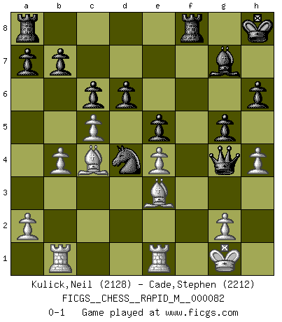 Last move : 0-1 2016 February 15 13:53:27 [Event "FICGS__CHESS__RAPID_M__000082"] [Site "FICGS"] [Date "2016.02.08"] [Round "1"] [White "Kulick,Neil"] [Black "Cade,Stephen"] [Result "0-1"] [WhiteElo "2128"] [BlackElo "2212"] 1.d4 Nf6 2.c4 g6 3.Nc3 Bg7 4.e4 d6 5.Nf3 O-O 6.Be2 e5 7.O-O Nc6 8.d5 Ne7 9.b4 Nh5 10.Re1 f5 11.Ng5 Nf6 12.f3 Kh8 13.Rb1 h6 14.Ne6 Bxe6 15.dxe6 fxe4 16.fxe4 Nc6 17.Nd5 Ng8 18.Bd3 Nd4 19.Qg4 g5 20.c5 c6 21.h4 Nf6 22.Nxf6 Qxf6 23.Be3 Qxe6 24.Bc4 Qxg4 0-1 King's Indian : Orthodox, Aronin-Taimanov variation (Yugoslav attack / Mar del Plata variation) Kingside Castling by player Black (move 5) Kingside Castling by player White (move 7) Player Black won this chess game. Follow this game move after move (download)What is the object of playing a gambit opening?... To acquire a reputation of being a dashing player at the cost of losing a game. (Siegbert Tarrasch) Immer nach dem besten Zug zu suchen ist ziemlich unpraktisch. (Nigel Short) En la vida, como en el Ajedrez, los Peones propios obstruyen nuestro camino. La gran fortuna de un hombre, su comodidad, placer, hijos, libros, que deberían ayudarle a ganar, con mucha frecuencia lo ponen en Jaque Mate. (Charles Buxton) Le profane ne songe pas à la somme de jouissance dont il se prive, qui méconnaît ce jeu aux ressources aussi variées que passionnantes. (Jean-Marie Jeanton-Lamarche) I don't know, I don't care, and it doesn't make any difference. (Albert Einstein)