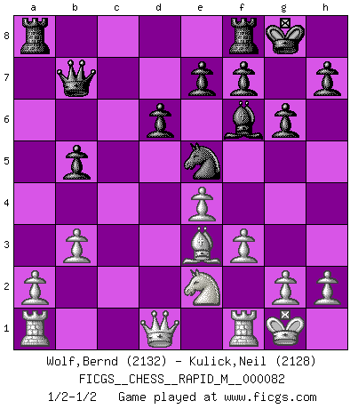 Last move : 1/2-1/2 2016 February 25 8:7:3 [Event "FICGS__CHESS__RAPID_M__000082"] [Site "FICGS"] [Date "2016.02.08"] [Round "1"] [White "Wolf,Bernd"] [Black "Kulick,Neil"] [Result "1/2-1/2"] [WhiteElo "2132"] [BlackElo "2128"] 1.e4 c5 2.Nf3 d6 3.Bb5+ Bd7 4.Bxd7+ Qxd7 5.c4 Nc6 6.Nc3 Nf6 7.O-O g6 8.d4 cxd4 9.Nxd4 Bg7 10.Nde2 O-O 11.f3 a6 12.Be3 Ne5 13.b3 b5 14.Nd5 Qb7 15.Nxf6+ Bxf6 16.cxb5 axb5 1/2-1/2 Sicilian : Canal-Sokolsky attack, Sokolsky variation Kingside Castling by player White (move 7) Kingside Castling by player Black (move 10) This chess game ended in a draw. Follow this game move after move (download)A thorough understanding of the typical mating continuations makes the most complicated sacrificial combinations leading up to them not only not difficult, but almost a matter of course. (Siegbert Tarrasch) Zum Sieg gelangt man nicht, wenn man gut, sondern nur wenn man besser spielt (Savielly Grigorievitsch Tartakower) Las Aperturas te enseñan aperturas. ¡Los Finales te enseñan Ajedrez!. (Stephan Gerzadowicz) Ne tendez aucun piège pour le plaisir ! Ne jouez rien dans l'espoir que l'adversaire réagisse de façon stupide ! Prenez toujours pour acquis que l'adversaire va trouver le meilleur coup ! Ne jouez jamais de coup dans l'espoir que l'adversaire ne voie pas la menace ! Chacun de vos coups doit améliorer la position d'une façon ou d'une autre. All maxims have their antagonist maxims; proverbs should be sold in pairs, a single one being but a half truth. (William Mathews)