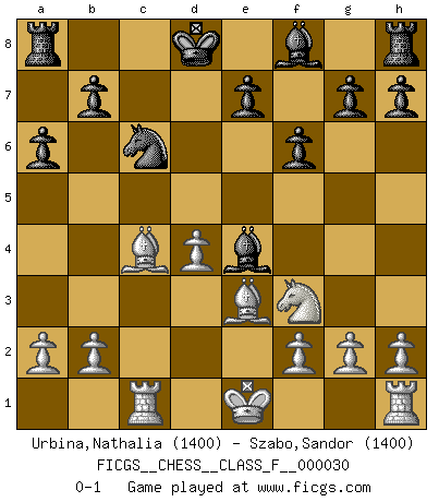 Last move : 0-1 2007 June 28 15:10:16 [Event "FICGS__CHESS__CLASS_F__000030"] [Site "FICGS"] [Date "2007.03.20"] [Round "1"] [White "Urbina,Nathalia"] [Black "Szabo,Sandor"] [Result "0-1"] [WhiteElo "1400"] [BlackElo "1400"] 1.e4 d5 2.exd5 Nf6 3.Nc3 Nxd5 4.Nxd5 Qxd5 5.Nf3 Bf5 6.d4 Qe4+ 7.Be3 Qxc2 8.Qxc2 Bxc2 9.Rc1 Be4 10.Rxc7 f6 11.Bb5+ Kd8 12.Rc1 a6 13.Bc4 Nc6 0-1 Scandinavian defense Player Black won this chess game. Follow this game move after move (download)A good player is always lucky. (Jose Raul Capablanca) Eine Person mit durchschnittlichem IQ kann etwa eine ELO von 2000 erreichen. (Jonathan Levitt) No volvere nunca a jugar contigo. Has insultado a mi amigo. - cuando un oponente se maldijo por una mala jugada (Miguel Najdorf) Toute estimation doit être constamment réévaluée. (Jacob Estrin) Drag your thoughts away from your troubles... by the ears, by the heels, or any other way you can manage it. (Mark Twain)