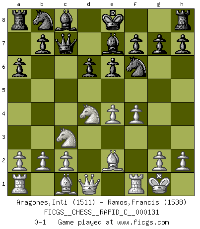 Last move : 0-1 2016 March 25 6:59:13 [Event "FICGS__CHESS__RAPID_C__000131"] [Site "FICGS"] [Date "2016.02.11"] [Round "1"] [White "Aragones,Inti"] [Black "Ramos,Francis"] [Result "0-1"] [WhiteElo "1511"] [BlackElo "1538"] 1.e4 c5 2.Nf3 d6 3.d4 cxd4 4.Nxd4 Nf6 5.Nc3 a6 6.Be2 e6 7.O-O Be7 8.f4 Qc7 0-1 This chess game has been lost on time (started : 2016.02.11 16:10:40) Sicilian : Najdorf, Opovcensky variation Kingside Castling by player White (move 7) Player Black won this chess game. Follow this game move after move (download)The hallmark of the artist is simplicity. (Larry Evans) Dieses schreckliche Gefühl, dass ich gegen eine Maschine spielte, die niemals Fehler macht, zerschmetterte meinen Widerstand. (Mark Taimanov) No hay otro maestro que tenga una voluntad terrífica de ganar. Al tablero, el irradía peligro y aún los oponentes mas fuertes tienden a congelarse como liebres cuando olfatean a una pantera. Aún sus debilidades son peligrosas. Con las blancas, su juego de apertura es predecible - te es posible hacer planes en su contra - pero es tan fuerte que tus planes casi nunca funcionan. En el juego medio, su precisión e invención son fabulosas y en finales, tú simplemente no le puedes vencer. (Experto Alemán anónimo) Le jeu d'échecs fait naître et fortifie en nous plusieurs qualités précieuses dans le cours de l'existence, telles que la prévoyance, la circonspection, la prudence, et la persévérance. (Benjamin Franklin - 1783, la morale des échecs) Perhaps chess is the wrong game for the times (The Chess Master and the Computer, by Garry Kasparov - 2010)