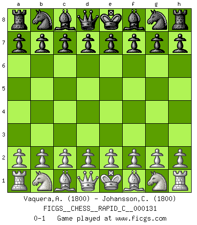 Last move : 0-1 2016 March 12 18:21:54 [Event "FICGS__CHESS__RAPID_C__000131"] [Site "FICGS"] [Date "2016.02.11"] [Round "1"] [White "Vaquera,Antonio"] [Black "Johansson,Christoffer"] [Result "0-1"] [WhiteElo "1800"] [BlackElo "1800"] 0-1 This chess game has been lost on time (started : 2016.02.11 16:10:40) Player Black won this chess game. Follow this game move after move (download)By playing at Chess then, we may learn: First: Foresight... Second: Circumspection... Third: Caution... And lastly, we learn by Chess the habit of not being discouraged by present bad appearances in the state of our affairs, the habit of hoping for a favorable chance, and that of persevering in the secrets of resources. (Benjamin Franklin) Karpov ist ein Museumsstück. (Garry Kasparov) Solo el jugador con la iniciativa tiene el derecho a atacar. (Wilhelm Steinitz) Les ravages du H expliquent la différence de niveau entre Tal et Thal [Abergel]. Art is the triumph over chaos. (John Cheever)