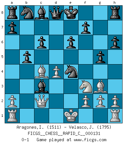 Last move : 0-1 2016 February 17 22:19:1 [Event "FICGS__CHESS__RAPID_C__000131"] [Site "FICGS"] [Date "2016.02.11"] [Round "1"] [White "Aragones,Inti"] [Black "Velasco,Jose Maria"] [Result "0-1"] [WhiteElo "1511"] [BlackElo "1795"] 1.d4 Nf6 2.c4 e6 3.Nf3 d5 4.Nc3 c6 5.Bg5 h6 6.Bh4 dxc4 7.e4 g5 8.Bg3 b5 9.b4 Bxb4 10.Qc2 Nxe4 11.Bxc4 Bxc3+ 0-1 Queen's pawn game Player Black won this chess game. Follow this game move after move (download)Alekhine is a poet who creates a work of art out of something that would hardly inspire another man to send home a picture post card. (Max Euwe) Auf jeden Fall musst du zuerst Rechtsanwalt werden, damit du deine eigenen Interessen und die deiner Familie vertreten kannst. [Brief an seinen Sohn] (José Raúl Capablanca) Fischer es una tragedia del Ajedrez Americano a la par con Morphy y Pillsbury. (Mig Greengard) Le profane ne songe pas à la somme de jouissance dont il se prive, qui méconnaît ce jeu aux ressources aussi variées que passionnantes. (Jean-Marie Jeanton-Lamarche) Control your own destiny or someone else will. (Jack Welch)