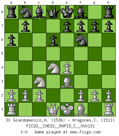 Last move : 1-0 2016 March 27 8:26:38 [Event "FICGS__CHESS__RAPID_C__000131"] [Site "FICGS"] [Date "2016.02.11"] [Round "1"] [White "Di Giandomenico,Alfonso"] [Black "Aragones,Inti"] [Result "1-0"] [WhiteElo "1536"] [BlackElo "1511"] 1.e4 c5 2.Nf3 d6 3.d4 cxd4 4.Nxd4 Nf6 5.Nc3 a6 6.Be3 1-0 This chess game has been lost on time (started : 2016.02.11 16:10:40) Sicilian : Najdorf, Byrne (English) attack Player White won this chess game. Follow this game move after move (download)A sacrifice is best refuted by accepting it. (Wilhelm Steinitz) Modernes Schach sorgt sich zuviel um Dinge wie Bauernstruktur usw. Vergessen Sie das, Schachmatt beendet das Spiel! (Nigel Short) El Ajedrez es tan inspirador que yo no creo que un buen jugador sea capaz de tener un pensamiento malo durante una partida. (Wilhelm Steinitz) Le temps de noter son nom sur la feuille de partie, j'étais déjà en zeitnot ! D'un modeste amateur apparié lors de la première ronde d'un open contre le grand-maître Azmaïparashvili. Don't anthropomorphize computers - they hate it. (Anonymous)