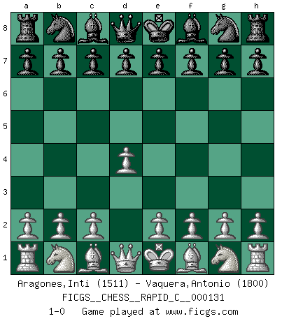 Last move : 1-0 2016 March 13 6:26:20 [Event "FICGS__CHESS__RAPID_C__000131"] [Site "FICGS"] [Date "2016.02.11"] [Round "1"] [White "Aragones,Inti"] [Black "Vaquera,Antonio"] [Result "1-0"] [WhiteElo "1511"] [BlackElo "1800"] 1.d4 1-0 This chess game has been lost on time (started : 2016.02.11 16:10:40) Queen's pawn Player White won this chess game. Follow this game move after move (download)By this measure (on the gap between Fischer & his contemporaries), I consider him the greatest world champion. (Garry Kasparov) Ich verstehe Aljechins Kombinationen ganz gut; aber woher er diese Angriffschancen bekommt und wie er die Eröffnung behandelt das ist für mich ein Buch mit sieben Siegeln. (Rudolf Spielmann) Evita las multitudes. Haz independientemente tu propio razonamiento. Trata de ser el jugador de Ajedrez, no la pieza de Ajedrez. (Ralph Charell) À la honte des hommes, on sait que les lois du jeu sont les seules qui soient partout justes, claires, inviolables et exécutées. Pourquoi l'Indien qui a donné les règles du jeu d'échecs est-il obéi de bon gré dans toute la terre, et que les décrétales des papes, par exemple, sont aujourd'hui un objet d'horreur et de mépris ? C'est que l'inventeur des échecs combina tout avec justesse pour la satisfaction des joueurs, et que les papes, dans leurs décrétales, n'eurent en vue que leur seul avantage. L'Indien voulut exercer également l'esprit des hommes et leur donner du plaisir; les papes ont voulu abrutir l'esprit des hommes. Voltaire (Dictionnaire philosophique / Garnier 1967) The age of a woman doesn't mean a thing. The best tunes are played on the oldest fiddles. (Ralph Waldo Emerson)