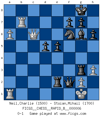 Last move : 0-1 2006 July 15 10:23:34 [Event "FICGS__CHESS__RAPID_B__000006"] [Site "FICGS"] [Date "2006.05.31"] [Round "1"] [White "Neil,Charlie"] [Black "Stoian,Mihail"] [Result "0-1"] [WhiteElo "1500"] [BlackElo "1700"] 1.e4 e5 2.Nf3 Nc6 3.Bb5 Nf6 4.O-O d6 5.Re1 Be7 6.d4 O-O 7.c3 Bg4 8.h3 Bh5 9.d5 Nb8 10.Nbd2 c6 11.dxc6 bxc6 12.Bc4 Nbd7 13.Nf1 Nc5 14.Ng3 Bg6 15.Nd2 d5 16.exd5 cxd5 17.Be2 Qc7 18.Nb3 a5 19.Be3 a4 20.Bxc5 axb3 21.Bxe7 Qxe7 22.Qxb3 Rfb8 23.Qd1 Rxb2 24.a4 Rc8 25.a5 Rxc3 26.a6 Qa7 27.Qa4 Rxg3 28.Qc6 h6 29.Reb1 Rxe2 30.Rb7 Qxf2+ 0-1 Ruy Lopez : Berlin defense, 4.O-O, d6 Kingside Castling by player White (move 4) Kingside Castling by player Black (move 6) Player Black won this chess game. Follow this game move after move (download)Chess demands total concentration. (Bobby Fischer) Man braucht nicht immer den besten Zug zu spielen: Ein Zug muß aktiv, unternehmungslustig, korrekt und schön sein. (David Bronstein) El Ajedrez demanda una total concentración. (Bobby Fischer) Les échecs, c'est la lutte contre l'erreur. (Johannes Zukertort) If you ain't just a little scared when you enter a casino, you are either very rich or you haven't studied the games enough. (Pappy)