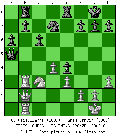 Last move : 1/2-1/2 2016 February 12 14:44:52 [Event "FICGS__CHESS__LIGHTNING_BRONZE__000616"] [Site "FICGS"] [Date "2016.02.12"] [Round "1"] [White "Cirulis,Ilmars"] [Black "Gray,Garvin"] [Result "1/2-1/2"] [WhiteElo "1839"] [BlackElo "2385"] 1.b4 e5 2.a3 d5 3.e3 Nf6 4.Bb2 Bd6 5.c4 c6 6.Nf3 Nbd7 7.d4 e4 8.Nfd2 O-O 9.Nc3 dxc4 10.Nxc4 Nb6 11.Nxd6 Qxd6 12.Qc2 Be6 13.Be2 Bc4 14.O-O Bxe2 15.Qxe2 a6 16.a4 Rfe8 17.Rfc1 Qxb4 18.Ba3 Qa5 19.Qb2 Rab8 20.Bb4 Qf5 21.a5 Nc8 22.Ra3 Qd7 23.Bc5 Nd6 24.Bxd6 Qxd6 25.h3 Qc7 26.Rb3 Nd7 27.Rb1 Qxa5 1/2-1/2 Polish (Sokolsky) opening Kingside Castling by player Black (move 8) Kingside Castling by player White (move 14) This chess game ended in a draw. Follow this game move after move (download)Winning isn't everything... but losing is nothing. (Mednis) Du weisst es gibt ein Problem mit Computern und Fernschach, wenn jeder eine Rating von 2450 hat. (John Christen Knudsen) La única cosa que los jugadores de Ajedrez tienen en común, es el Ajedrez. (Lodewijk Prins) Des combinaisons [dans le jeu d'échecs] pareilles à des mélodies. Je crois entendre pour ainsi dire la musique des coups... (Vladimir Nabokov) Luck is the residue of design. (John Milton)