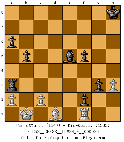 Last move : 0-1 2007 August 9 0:29:29 [Event "FICGS__CHESS__CLASS_F__000030"] [Site "FICGS"] [Date "2007.03.20"] [Round "1"] [White "Perrotta,John Zach"] [Black "Kis-Kos,Laszlo"] [Result "0-1"] [WhiteElo "1347"] [BlackElo "1332"] 1.e4 c5 2.Nf3 d6 3.d4 cxd4 4.Nxd4 Nf6 5.Nc3 a6 6.Qf3 e6 7.g4 e5 8.Nf5 Nc6 9.Bg5 Bxf5 10.gxf5 Nd4 11.Qd3 Be7 12.O-O-O O-O 13.Rg1 Kh8 14.Ne2 Nxe2+ 15.Bxe2 Rc8 16.f4 Qa5 17.Kb1 b5 18.Bxf6 Bxf6 19.Qxd6 Rfd8 20.Qa3 Qxa3 21.bxa3 exf4 22.Rxd8+ Rxd8 23.Bd3 Rd4 24.Rf1 Be5 25.Rf3 Ra4 26.Be2 Rxe4 27.Rd3 g6 28.Bg4 Re1+ 29.Rd1 Re3 30.fxg6 hxg6 31.Rf1 f5 32.Bd1 g5 33.Kc1 Rxa3 34.Rg1 g4 35.Kb1 f3 36.h3 f2 37.Rf1 g3 0-1 Sicilian : Najdorf Queenside Castling by player White (move 12) Kingside Castling by player Black (move 12) Player Black won this chess game. Follow this game move after move (download)I'd rather have a Pawn than a finger. (Reuben Fine) Es war undenkbar für die Behörden, dass ein sowjetischer Großmeister auf diese Art und Weise [Fischer-Taimanov 6:0] verliert, ohne dass es eine politischer Erklärung dafür gäbe. (Mark Taimanov) Yo considero que Fischer es uno de los expertos mas grandes de aperturas de siempre. (Keith Hayward) Avec des compensations pour le matériel en plus... (Anonyme) Life doesn't imitate art, it imitates bad television. (Woody Allen)