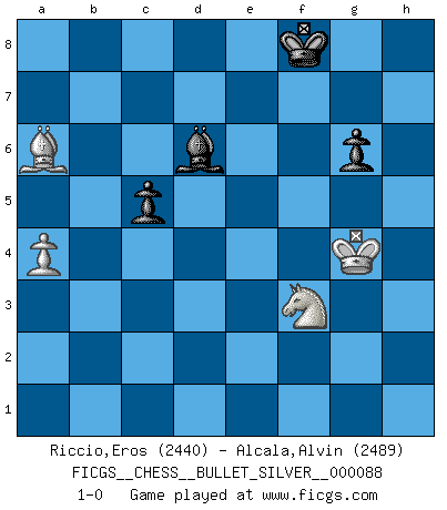 Last move : 1-0 2016 February 13 17:36:51 [Event "FICGS__CHESS__BULLET_SILVER__000088"] [Site "FICGS"] [Date "2016.02.13"] [Round "1"] [White "Riccio,Eros"] [Black "Alcala,Alvin"] [Result "1-0"] [WhiteElo "2440"] [BlackElo "2489"] 1.e4 e5 2.Nf3 Nc6 3.Bb5 a6 4.Ba4 Nf6 5.d3 Bc5 6.c3 b5 7.Bb3 d6 8.O-O O-O 9.Bg5 h6 10.Bh4 Rb8 11.Nbd2 Bb6 12.a4 g5 13.Bg3 b4 14.h3 Ba7 15.Bc4 Na5 16.Ba2 Nh5 17.Bh2 Nf4 18.Bxf4 gxf4 19.d4 bxc3 20.bxc3 Qf6 21.Rb1 Rxb1 22.Qxb1 Qg7 23.Kh2 Kh8 24.Bd5 Rg8 25.Rg1 Bb6 26.Qd3 Re8 27.g4 fxg3+ 28.fxg3 Rg8 29.Rg2 Qf6 30.Rf2 c6 31.Ba2 exd4 32.cxd4 Bd8 33.Nf1 Qg7 34.Qa3 Nb7 35.Qc1 c5 36.Bd5 Be7 37.g4 h5 38.Kh1 Qg6 39.Rh2 Rg7 40.Ng3 hxg4 41.hxg4 Rh7 42.Nf5 Bxf5 43.exf5 Qxg4 44.Qc2 Rxh2+ 45.Qxh2+ Kg7 46.Bxb7 Qxf5 47.dxc5 Qd3 48.Qg2+ Kf8 49.Qh3 Qb1+ 50.Kg2 Qc2+ 51.Kg3 Qg6+ 52.Qg4 dxc5 53.Qxg6 fxg6 54.Bxa6 Bd6+ 55.Kg4 1-0 Thibault de Vassal Big game! Finally, Alvin lost one ^^ Ruy Lopez : Anderssen variation Kingside Castling by player White (move 8) Kingside Castling by player Black (move 8) 10 pieces endgame at move 53 : White KQBNP , Black KBPPP WHITE : King + 1 Queen 1 Bishop 1 Knight 1 Pawn BLACK : King + 1 Bishop 3 Pawns 9 pieces endgame at move 53 : White KBNP , Black KBPPP WHITE : King + 1 Bishop 1 Knight 1 Pawn BLACK : King + 1 Bishop 3 Pawns 8 pieces endgame at move 54 : White KBNP , Black KBPP WHITE : King + 1 Bishop 1 Knight 1 Pawn BLACK : King + 1 Bishop 2 Pawns Player White won this chess game. Follow this game move after move (download)Blessed be the memory of him who gave the world this immortal game. (A. G. Gardiner) Ich bin Weltmeister und muß mit niemandem irgend etwas diskutieren. (Viswanathan Anand) Por la belleza de sus partidas, la claridad de su juego y lo brillante de sus ideas, Fischer se creó el mismo como un artista de la misma estatura como Brahms, Rembrandt y Shakespeare. (David Levy) Il a essayé de se convaincre qu'il pourrait empêcher toutes les erreurs et ne jamais perdre. L'horreur ! Gary Kasparov au sujet de Robert Fischer. When you have everything, sometimes it feels like nothing. (Horatio Caine, C.S.I. Miami)