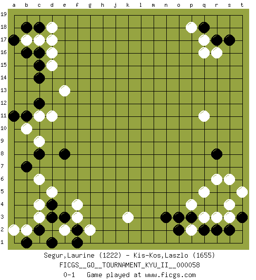 Last move : 0-1 2016 March 30 20:41:40 [Event "FICGS__GO__TOURNAMENT_KYU_II__000058"] [Site "FICGS"] [Date "2016.02.13"] [Round "1"] [Black "Segur,Laurine"] [White "Kis-Kos,Laszlo"] [Result "0-1"] [Rating 1 "1222"] [Rating 2 "1655"] 1.d4 q16 2.q4 d16 3.c8 k3 4.n3 f3 5.e3 f4 6.c14 d11 7.c12 c11 8.c16 c17 9.b16 d15 10.c15 b17 11.b11 b10 12.a11 c9 13.a17 d18 14.b18 e13 15.c18 d17 16.r8 r3 17.r4 q3 18.p3 p2 19.o2 p4 20.o3 s4 21.q2 q5 22.r5 r6 23.s5 s6 24.e8 c3 25.d3 c4 26.c2 b2 27.d1 c6 28.b7 d5 29.b1 a2 30.f2 g2 31.f1 e2 32.r2 s3 33.s2 q11 34.t3 t5 35.r17 q17 36.q18 r16 37.s17 p18 0-1 Here are the names of the openings (joseki) played in the four corners : Corner d16 : d16 c14 Hoshi (Hwajeom, Seongjeom, Xingwei`) 4-4 Point. The star or hoshi (4-4) point, emphasizing influence at the potential expense of territory. Ikken Kakari (Hankan Keolch'im, Yi Gua`jiao~, 1-Space Low Approach). Black 2 is the standard approach move to the 4-4. Player White won this Go (weiqi, baduk) game. Follow this game move after move (download)The intersection is rarely neutral. (Pierre Audouard) The real danger is not that computers will begin to think like men, but that men will begin to think like computers. (Sydney J. Harris)