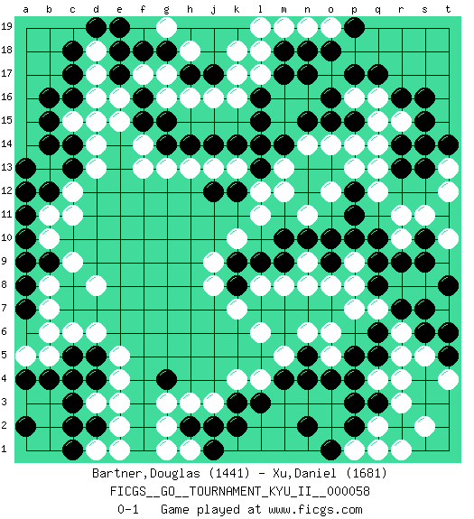 Last move : 0-1 2016 September 21 17:34:12 [Event "FICGS__GO__TOURNAMENT_KYU_II__000058"] [Site "FICGS"] [Date "2016.02.13"] [Round "1"] [Black "Bartner,Douglas"] [White "Xu,Daniel"] [Result "0-1"] [Rating 1 "1441"] [Rating 2 "1681"] 1.r16 d16 2.q3 d3 3.d5 d8 4.g4 e5 5.d4 e4 6.c3 e3 7.c2 d6 8.d2 e2 9.q5 l4 10.k3 k4 11.l3 j3 12.m4 l6 13.j2 m5 14.n4 h3 15.h2 g3 16.p17 k16 17.c14 c12 18.b16 c15 19.b15 d14 20.c13 d13 21.c17 d17 22.c18 k10 23.b12 b13 24.b14 b11 25.a13 c11 26.h17 k18 27.e18 d18 28.d19 f17 29.f18 g17 30.g18 h16 31.j17 j16 32.k12 m12 33.k14 l11 34.l15 j13 35.l16 k17 36.j12 k13 37.l13 l12 38.j14 h13 39.h14 g13 40.q10 q12 41.o10 r10 42.r9 r11 43.s9 o12 44.n17 p9 45.p10 p7 46.q8 p8 47.q9 r5 48.q6 r3 49.r2 b5 50.b4 c6 51.a2 m8 52.p12 p13 53.p11 q14 54.s14 o14 55.n15 q4 56.p4 r4 57.p5 q2 58.p3 s2 59.p2 r1 60.g14 f13 61.m10 q7 62.r7 r6 63.s7 q16 64.q17 r15 65.s15 m13 66.l9 j8 67.k9 j9 68.s6 s5 69.s10 s11 70.t8 n9 71.n10 l8 72.k8 k7 73.a11 b10 74.a10 a9 75.a12 a5 76.c4 n19 77.n18 m19 78.o18 p1 79.o1 q1 80.n2 h18 81.e17 e16 82.c16 d15 83.m18 l18 84.l14 o6 85.f16 g16 86.f15 g19 87.e19 l19 88.r14 q15 89.r13 q13 90.n5 n6 91.o9 o8 92.m9 n8 93.o15 n14 94.c5 t13 95.s16 g2 96.b9 b8 97.a8 c9 98.a9 b7 99.a4 h1 100.k2 o19 101.p19 t10 102.t6 f14 103.g15 p16 104.o16 o5 105.o4 d1 106.c1 e1 107.j1 g1 108.a7 b6 109.t5 t4 110.s13 t12 111.t14 n11 112.p15 p14 113.m14 l17 114.m17 e15 0-1 Here are the names of the openings (joseki) played in the four corners : Corner d4 : d3 d5 Komoku (Somok, Xiao~mu`) 3-4 Point. The komoku (3-4) point is the traditional corner enclosure move.. Ikken Takagakari (Hankan Nop'dakeolch'im, Yi Gaogua`jiao~, 1-Space High Approach). The 5-4 approach move has become more popular in modern times, as modern Go emphasizes speed and influence. Corner d16 : d16 c14 Hoshi (Hwajeom, Seongjeom, Xingwei`) 4-4 Point. The star or hoshi (4-4) point, emphasizing influence at the potential expense of territory. Ikken Kakari (Hankan Keolch'im, Yi Gua`jiao~, 1-Space Low Approach). Black 2 is the standard approach move to the 4-4. Player White won this Go (weiqi, baduk) game. Follow this game move after move (download)The carpenter's square becomes ko. (Anonymous) Be who you are, and say what you feel because those who mind don't matter, and those who matter don't mind. (Dr Seuss)
