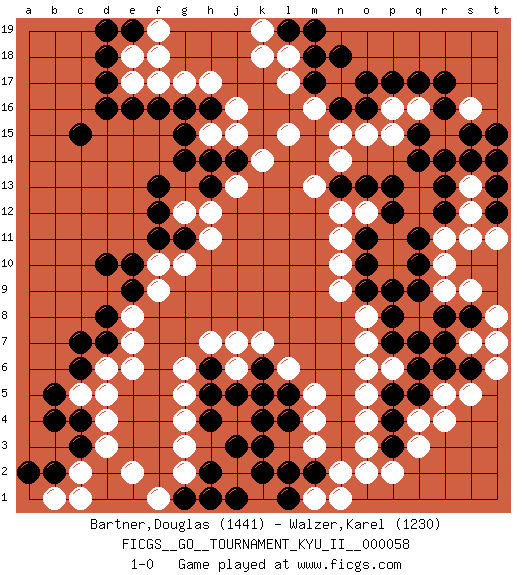 Last move : 1-0 2016 March 25 20:18:29 [Event "FICGS__GO__TOURNAMENT_KYU_II__000058"] [Site "FICGS"] [Date "2016.02.13"] [Round "1"] [Black "Bartner,Douglas"] [White "Walzer,Karel"] [Result "1-0"] [Rating 1 "1441"] [Rating 2 "1230"] 1.r16 d4 2.d17 q3 3.c15 r5 4.k3 j4 5.j3 p16 6.p17 q16 7.q17 r15 8.o16 s16 9.r17 o15 10.n16 n15 11.q15 p15 12.q14 r11 13.r14 m16 14.m17 n17 15.o17 l17 16.m18 l15 17.d10 l18 18.n18 g17 19.q9 r9 20.r8 s9 21.q7 s13 22.s15 o12 23.c6 g3 24.k4 m4 25.h4 g4 26.j5 o8 27.q5 q4 28.p5 o4 29.r6 s5 30.o10 n10 31.o9 n9 32.o11 n11 33.p12 s7 34.s8 t8 35.s6 t6 36.p8 h11 37.g15 h15 38.h14 j13 39.g14 j15 40.f12 j7 41.m2 o2 42.p4 o3 43.p3 p2 44.c3 d3 45.c4 d6 46.d7 e6 47.c7 f9 48.e10 f10 49.h6 h7 50.f11 o7 51.o13 n12 52.p13 p11 53.q11 p10 54.p9 l6 55.h2 g2 56.k2 e17 57.d16 g6 58.j1 r4 59.j14 k14 60.g16 h17 61.h16 j16 62.n13 m13 63.g11 g10 64.r12 r10 65.q10 s12 66.k6 k7 67.l5 m5 68.l4 o5 69.h13 h12 70.g1 f1 71.h1 e2 72.e9 e8 73.d8 e7 74.e16 e18 75.d18 c2 76.b2 c5 77.b5 d5 78.b4 b1 79.e19 f18 80.a2 p6 81.q6 j6 82.h5 g5 83.r13 g12 84.f13 t14 85.t15 m3 86.s14 s11 87.t13 n2 88.l2 f19 89.d19 n14 90.l19 k19 91.m19 k18 92.p7 o6 93.f16 f17 94.t12 t11 95.t14 m1 96.l1 n1 97.k5 c1 98.r7 t7 99.pass pass 100.pass 1-0 Here are the names of the openings (joseki) played in the four corners : Corner q16 : r16 p16 Komoku (Somok, Xiao~mu`) 3-4 Point. The komoku (3-4) point is the traditional corner enclosure move.. Ikken Takagakari (Hankan Nop'dakeolch'im, Yi Gaogua`jiao~, 1-Space High Approach). The 5-4 approach move has become more popular in modern times, as modern Go emphasizes speed and influence. Player Black won this Go (weiqi, baduk) game. Follow this game move after move (download)Go is not a blocking game, it's a game of action. (Pierre Audouard) My poor ole parrot... Is not in the circulation of displays ....poo hoo hoo :) (Wayne Lowrance's enigma)