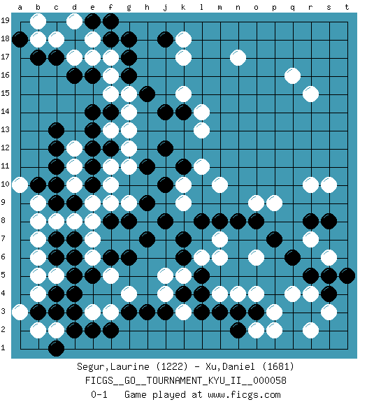 Last move : 0-1 2016 August 31 1:51:8 [Event "FICGS__GO__TOURNAMENT_KYU_II__000058"] [Site "FICGS"] [Date "2016.02.13"] [Round "1"] [Black "Segur,Laurine"] [White "Xu,Daniel"] [Result "0-1"] [Rating 1 "1222"] [Rating 2 "1681"] 1.d4 q16 2.d16 q4 3.c13 k17 4.g17 n17 5.d9 k3 6.g3 r10 7.j18 k10 8.o3 o4 9.m3 n4 10.n3 p3 11.l4 f3 12.f2 e3 13.d3 g4 14.h3 f5 15.e2 j5 16.k4 j4 17.j3 r15 18.r5 r4 19.s4 s3 20.t5 r7 21.q6 o6 22.p7 p9 23.o8 o9 24.n8 m10 25.l8 m7 26.m8 m6 27.k7 k5 28.h7 e8 29.h9 d8 30.c9 c8 31.d6 e6 32.h11 e9 33.e11 k15 34.l5 l6 35.k6 b9 36.b10 b8 37.d7 e7 38.g6 c5 39.d5 b4 40.c4 b6 41.b3 a3 42.c7 b2 43.c3 c2 44.d2 b7 45.c6 b5 46.c1 f11 47.f12 d10 48.c10 d11 49.e10 d12 50.c12 a10 51.c11 f10 52.e12 g9 53.j8 g11 54.g8 g12 55.j12 g14 56.j14 f15 57.e14 f17 58.h15 f13 59.e13 g15 60.g16 f16 61.g18 d17 62.c17 c18 63.b17 e18 64.f18 b18 65.e16 e17 66.f14 g13 67.e5 l13 68.k14 l14 69.a18 k18 70.f8 f9 71.k11 l11 72.j10 k9 73.s8 s6 74.s5 r2 75.r8 s10 76.e19 d19 77.f19 b19 78.f6 m4 79.l3 o2 80.n2 p2 0-1 Here are the names of the openings (joseki) played in the four corners : Corner q4 : q4 o3 Hoshi (Hwajeom, Seongjeom, Xingwei`) 4-4 Point. The star or hoshi (4-4) point, emphasizing influence at the potential expense of territory. Ikken Kakari (Hankan Keolch'im, Yi Gua`jiao~, 1-Space Low Approach). Black 2 is the standard approach move to the 4-4. Player White won this Go (weiqi, baduk) game. Follow this game move after move (download)Ikken tobi is never wrong. (Anonymous) There are three kinds of lies: lies, damned lies and statistics. (Mark Twain)