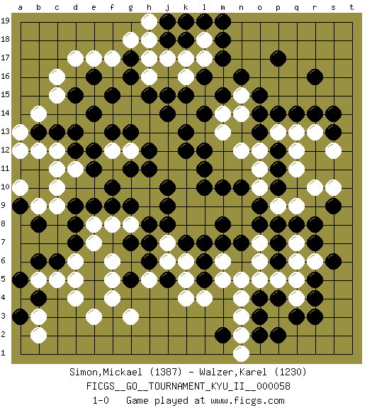 Last move : 1-0 2016 August 1 14:15:0 [Event "FICGS__GO__TOURNAMENT_KYU_II__000058"] [Site "FICGS"] [Date "2016.02.13"] [Round "1"] [Black "Simon,Mickael"] [White "Walzer,Karel"] [Result "1-0"] [Rating 1 "1387"] [Rating 2 "1230"] 1.r16 d4 2.q3 c16 3.e16 d17 4.d15 e17 5.g16 c15 6.d13 q5 7.r5 q4 8.r4 p3 9.r3 q6 10.r7 q7 11.r8 l4 12.p17 g3 13.c6 d6 14.d7 c5 15.e6 d5 16.b6 e7 17.d8 e8 18.d9 r6 19.s6 k17 20.m17 g18 21.q8 o7 22.e9 g8 23.b4 b5 24.a5 b3 25.a3 b2 26.o8 q12 27.r14 r13 28.q14 o12 29.l14 n8 30.o9 n9 31.n10 m13 32.l10 k8 33.n7 l9 34.m7 l8 35.m10 o10 36.p10 o11 37.p11 k10 38.l11 j12 39.k12 n15 40.l16 r10 41.p12 p13 42.o13 n12 43.o14 q13 44.p14 p9 45.p8 q9 46.p7 o6 47.p6 o5 48.p4 p5 49.o4 n4 50.o3 n3 51.o2 n5 52.m2 n2 53.p2 n1 54.k13 m14 55.n16 k16 56.k15 l17 57.m15 n14 58.g9 k11 59.l12 b12 60.b13 b14 61.c13 a13 62.b11 c12 63.d12 c11 64.b10 d11 65.e11 f12 66.e12 h14 67.g7 f8 68.h8 f6 69.e5 f5 70.e4 e3 71.k7 j7 72.h7 h9 73.j9 h10 74.j10 j11 75.h11 g10 76.f9 f4 77.g11 k9 78.j8 j6 79.m8 m9 80.l7 h13 81.h6 h5 82.j5 k6 83.s9 s10 84.j15 h17 85.s13 s12 86.o15 q11 87.s14 f14 88.m18 l18 89.l19 k19 90.m19 h16 91.h15 g15 92.f15 g14 93.e14 c10 94.l6 k5 95.l5 k4 96.h12 j13 97.f13 g12 98.f10 m5 99.j14 m6 100.g13 c9 101.b8 b9 102.a9 a10 103.a11 a12 104.g17 f17 105.j18 h18 106.k18 j17 107.j19 h19 108.k19 a10 109.g5 1-0 Here are the names of the openings (joseki) played in the four corners : Corner d16 : c16 e16 Komoku (Somok, Xiao~mu`) 3-4 Point. The komoku (3-4) point is the traditional corner enclosure move.. Ikken Takagakari (Hankan Nop'dakeolch'im, Yi Gaogua`jiao~, 1-Space High Approach). The 5-4 approach move has become more popular in modern times, as modern Go emphasizes speed and influence. Corner q4 : q3 q5 Komoku (Somok, Xiao~mu`) 3-4 Point. The komoku (3-4) point is the traditional corner enclosure move.. Ikken Takagakari (Hankan Nop'dakeolch'im, Yi Gaogua`jiao~, 1-Space High Approach). The 5-4 approach move has become more popular in modern times, as modern Go emphasizes speed and influence. Player Black won this Go (weiqi, baduk) game. Follow this game move after move (download)Every move brings change. (Pierre Audouard) When you've done things right people won't know you've done anything at all. (Futurama)