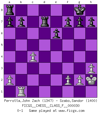 Last move : 0-1 2007 July 10 0:9:47 [Event "FICGS__CHESS__CLASS_F__000030"] [Site "FICGS"] [Date "2007.03.20"] [Round "1"] [White "Perrotta,John Zach"] [Black "Szabo,Sandor"] [Result "0-1"] [WhiteElo "1347"] [BlackElo "1400"] 1.e4 d5 2.exd5 Nf6 3.d4 Nxd5 4.Nf3 Bg4 5.Be2 e6 6.c4 Nf6 7.Bf4 Bb4+ 8.Nc3 Ne4 9.O-O Bxc3 10.bxc3 Nxc3 11.Qd3 Nxe2+ 12.Qxe2 O-O 13.h3 Bxf3 14.Qxf3 Nc6 15.Qg3 Nxd4 16.Bxc7 Ne2+ 17.Kh2 Nxg3 18.Bxd8 Nxf1+ 19.Rxf1 Rfxd8 20.Rb1 Rd7 0-1 Scandinavian : Marshall variation Kingside Castling by player White (move 9) Kingside Castling by player Black (move 12) Player Black won this chess game. Follow this game move after move (download)Everything is in a state of flux, and this includes the world of Chess. (Mikhail Botvinnik) Ich spiele 70 Eröffnungssysteme. (Viktor Kortschnoi) El jugador de combinación piensa hacia adelante; comienza de la posición dada y trabaja las movidas contundentes en su mente. (Emanuel Lasker) Vous n'êtes pas toujours obligé de jouer le meilleur coup. Un coup doit être actif, entreprenant, correct et beau ! (David Bronstein) Creativity is allowing yourself to make mistakes. Art is knowing which ones to keep. (Scott Adams)