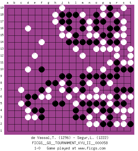 Last move : 1-0 2016 July 27 0:48:2 [Event "FICGS__GO__TOURNAMENT_KYU_II__000058"] [Site "FICGS"] [Date "2016.02.13"] [Round "1"] [Black "de Vassal,Thibault"] [White "Segur,Laurine"] [Result "1-0"] [Rating 1 "1296"] [Rating 2 "1222"] 1.q4 d16 2.q16 d4 3.f3 e3 4.f4 c7 5.l3 q13 6.r14 r13 7.r9 o13 8.q14 p14 9.p15 s14 10.s13 r15 11.q15 s16 12.r16 s15 13.s12 r18 14.q18 s17 15.r17 s19 16.o14 p13 17.n14 q11 18.r11 m12 19.k16 h17 20.j17 h18 21.j18 n16 22.o16 n15 23.m14 o15 24.o17 n17 25.p17 l16 26.l15 l17 27.k18 k15 28.k14 j15 29.l18 j16 30.k17 m18 31.m16 p19 32.q19 p18 33.o18 j19 34.m17 f14 35.o9 n10 36.n9 r12 37.k9 s11 38.r10 t12 39.s10 t11 40.t10 t13 41.f7 d10 42.f10 e12 43.e4 d3 44.d5 c5 45.d6 l13 46.l14 q6 47.r5 n6 48.o5 o7 49.p8 k6 50.m8 j7 51.h8 j8 52.j9 g6 53.h5 g7 54.g8 f6 55.e6 l7 56.k8 n8 57.m9 m4 58.l4 l5 59.m7 m6 60.k7 n3 61.n5 o4 62.p4 p6 63.p5 q8 64.q9 o6 65.j5 p10 66.p9 r2 67.p2 s4 68.s5 s3 69.t2 r4 70.q2 q5 71.s7 s6 72.r6 t6 73.t7 p3 74.q3 s2 75.m5 t4 76.r7 o2 77.m3 n2 78.n4 1-0 Here are the names of the openings (joseki) played in the four corners : Corner d4 : d4 f3 Hoshi (Hwajeom, Seongjeom, Xingwei`) 4-4 Point. The star or hoshi (4-4) point, emphasizing influence at the potential expense of territory. Ikken Kakari (Hankan Keolch'im, Yi Gua`jiao~, 1-Space Low Approach). Black 2 is the standard approach move to the 4-4. Corner q16 : q16 q13 Hoshi (Hwajeom, Seongjeom, Xingwei`) 4-4 Point. The star or hoshi (4-4) point, emphasizing influence at the potential expense of territory. Niken Takagakari (Dukan Nop'dakeolch'im, E`r Gaojia, 2-Space High Approach). White 2 is a light approach move. Rarely played in even games, White 2 is typically employed in handicap games. Black continues with 6-4 or 3-10. In Korean Sunjang Baduk Black has a stone on 8-4. Player Black won this Go (weiqi, baduk) game. Follow this game move after move (download)There is death in the hane. (Anonymous) War is the child of passion, passion is the child of narcissism and narcissism is the child. (...) Another game ? (Thibault de Vassal)