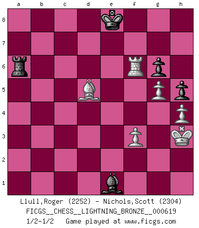 Last move : 1/2-1/2 2016 February 14 12:0:17 [Event "FICGS__CHESS__LIGHTNING_BRONZE__000619"] [Site "FICGS"] [Date "2016.02.14"] [Round "1"] [White "Llull,Roger"] [Black "Nichols,Scott"] [Result "1/2-1/2"] [WhiteElo "2252"] [BlackElo "2304"] 1.e4 c5 2.Nf3 Nc6 3.d4 cxd4 4.Nxd4 Nf6 5.Nc3 e5 6.Ndb5 d6 7.Bg5 a6 8.Na3 b5 9.Nd5 Be7 10.Bxf6 Bxf6 11.c3 O-O 12.Nc2 Bg5 13.a4 bxa4 14.Rxa4 a5 15.Bc4 Rb8 16.b3 Kh8 17.Nce3 g6 18.O-O f5 19.Qf3 Be6 20.Rd1 Qd7 21.h3 Qf7 22.Nf1 fxe4 23.Qxf7 Bxf7 24.Ng3 e3 25.Nxe3 Rxb3 26.Rxd6 Rb1+ 27.Kh2 Be8 28.Nd5 e4 29.Nxe4 Ne5 30.Ba2 Bxa4 31.Bxb1 Bd8 32.Re6 Nd7 33.c4 Bb3 34.Bd3 a4 35.f3 Kg8 36.Kg3 Rf7 37.Rd6 a3 38.Nd2 Ba4 39.Bb1 Kg7 40.h4 Ba5 41.Ra6 Bxd2 42.Rxa4 Bc1 43.c5 Nf6 44.Nb4 Be3 45.Nd3 Nh5+ 46.Kh2 Rc7 47.g4 Nf6 48.Rxa3 Nd7 49.c6 Rxc6 50.Kg3 Bd4 51.g5 Bb6 52.Ba2 h6 53.Bd5 Rd6 54.Be4 Nc5 55.Nxc5 Bxc5 56.Rc3 Bb6 57.Rb3 Re6 58.Kg4 h5+ 59.Kh3 Bc5 60.Rc3 Bb6 61.Rd3 Bc5 62.Rd5 Bb4 63.Rd7+ Kf8 64.Bb1 Bc3 65.Rb7 Bd4 66.Bc2 Bc3 67.Rc7 Be1 68.Be4 Bb4 69.Bd5 Ra6 70.Rf7+ Ke8 71.Rg7 Kf8 72.Rf7+ Ke8 73.Rb7 Be1 74.Rg7 Kf8 75.Rf7+ Ke8 76.Rf6 1/2-1/2 Sicilian : Pelikan (Lasker/Sveshnikov) variation Kingside Castling by player Black (move 11) Kingside Castling by player White (move 18) This chess game ended in a draw. Follow this game move after move (download)Don't even mention losing to me. I can't stand to think of it. (Bobby Fischer) Smyslow ist ein Beweis dafür, dass ich noch zehn Jahre spielen kann! [der 75 jährige über den 85 jährigen] (Viktor Kortschnoi) El Ajedrez es de 30 a 40 por ciento psicología. Uno no cuenta con esto cuando se juega contra una computadora. No lo puedo confundir. (Judith Polgar) Les Echecs représentent une sphère d'idées créatrices basée sur la volonté des deux protagonistes. (Smyslov) Fortune favours the audacious. (Desiderius Erasmus)