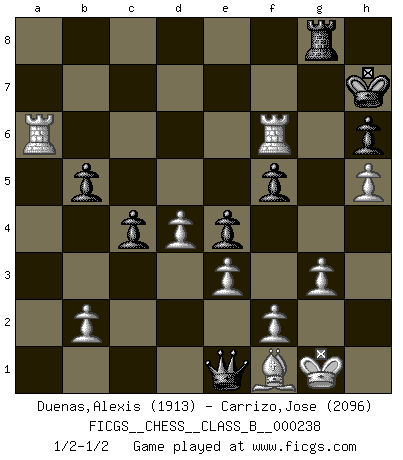 Last move : 1/2-1/2 2016 May 27 21:21:53 [Event "FICGS__CHESS__CLASS_B__000238"] [Site "FICGS"] [Date "2016.02.14"] [Round "1"] [White "Duenas,Alexis"] [Black "Carrizo,Jose"] [Result "1/2-1/2"] [WhiteElo "1913"] [BlackElo "2096"] 1.d4 d5 2.c4 e6 3.Nf3 c6 4.g3 dxc4 5.Bg2 b5 6.O-O Bb7 7.Ne5 Nf6 8.Nc3 Qc8 9.a4 a6 10.Qc2 Be7 11.Rd1 O-O 12.Bg5 h6 13.Bxf6 Bxf6 14.Ne4 Nd7 15.Nxd7 Qxd7 16.Nxf6+ gxf6 17.Qe4 Rfe8 18.Qf4 Kg7 19.e3 Rad8 20.Qg4+ Kh7 21.Qf4 f5 22.Qe5 Kg6 23.h4 Qd6 24.h5+ Kh7 25.Qf6 Qe7 26.Qe5 Rd7 27.axb5 axb5 28.Ra7 Red8 29.Rda1 f6 30.Qf4 Rg8 31.Bf3 Rg7 32.Qb8 Rc7 33.Ra8 Rc8 34.Qxc8 Bxc8 35.Rxc8 Rg8 36.Rxc6 e5 37.R1a6 e4 38.Be2 Qb4 39.Rxf6 Qe1+ 40.Bf1 1/2-1/2 Queen's gambit declined Kingside Castling by player White (move 6) Kingside Castling by player Black (move 11) This chess game ended in a draw. Follow this game move after move (download)In Chess, just as in life, today's bliss may be tomorrow's poison. (Assaic) Der Bart als Geschlechtszeichen mitten im Gesicht ist obszön. Daher gefällt er den Weibern. [Zugegeben, kein Schachzitat, aber unglaublich originell] (Arthur Schopenhauer) Con el tiempo, empecé a progresar en partidas decisivas. Tal vez porque me di cuenta de una simple verdad: no solo estaba yo nervioso sino también mi oponente. (Mikhail Tal) Même un GMI sait rarement calculer sur plus de cinq coups une attaque à sacrifices. (Rudolf Spielmann) Luck is what you have left over after you give 100 percent. (Langston Coleman)