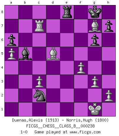 Last move : 1-0 2016 April 16 19:36:13 [Event "FICGS__CHESS__CLASS_B__000238"] [Site "FICGS"] [Date "2016.02.14"] [Round "1"] [White "Duenas,Alexis"] [Black "Norris,Hugh"] [Result "1-0"] [WhiteElo "1913"] [BlackElo "1800"] 1.d4 d5 2.c4 e6 3.Nf3 Nf6 4.g3 Be7 5.Bg2 O-O 6.O-O Nc6 7.Ne5 Nxe5 8.dxe5 Nd7 9.cxd5 Nxe5 10.dxe6 Bxe6 11.Qxd8 Raxd8 12.Bxb7 Bc4 13.Nc3 Bb4 14.Bf4 Bxc3 15.bxc3 Ng6 16.Be3 a6 17.Rfe1 Ne5 18.f4 Ng4 19.Bd4 Rfe8 20.e4 Nf6 21.e5 Nd5 22.a4 g6 23.a5 Bb5 24.Red1 f5 25.exf6 Ne3 26.Re1 Nc2 27.Re7 Nxa1 28.f7+ Kf8 29.fxe8Q+ Rxe8 30.Rxc7 Nc2 31.Bg7+ Kg8 32.Bd5+ 1-0 Queen's gambit declined Kingside Castling by player Black (move 5) Kingside Castling by player White (move 6) Promotion Queen by player White (move 29) Player White won this chess game. Follow this game move after move (download)In Fischer's hands, a slight theoretical advantage is as good a being a Queen ahead. (Isaac Kashdan) Irgendwie scheint mir sonntags früh um 9 Uhr der Killerinstinkt verloren gegangen zu sein. (Alexej Shirov) Cuando tengo las piezas blancas, yo gano porque soy blanco; Cuando tengo las piezas negras, yo gano porque soy Bogolyubov. (Bogolyubov) Dans le domaine de la peinture, de la gravure et de la sculpture, dès la première décennie de notre siècle, les artistes abandonnent la représentation de la partie d'échecs pour se concentrer sur les pièces, sur les échiquiers et sur toutes les variations auxquelles les unes et les autres peuvent donner lieu. On passe en quelque sorte d'un thème social à un thème musical (au sens de la musica médiévale, c'est-à-dire d'une notion qui inclue le rythme, l'harmonie, la construction et la déconstruction, etc.). Graphiquement et picturalement, l'échiquier apparaît comme une structure ouverte, dynamique, d'une richesse infinie, autorisant toutes les combinatoires et débouchant sur des mouvements et des rythmes de nature exponentielle. (Michel Pastoureau) Macintosh - we might not get everything right, but at least we knew the century was going to end. (Douglas Adams)