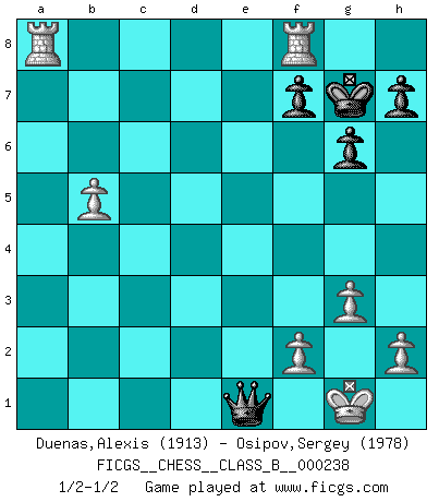 Last move : 1/2-1/2 2016 April 14 16:22:51 [Event "FICGS__CHESS__CLASS_B__000238"] [Site "FICGS"] [Date "2016.02.14"] [Round "1"] [White "Duenas,Alexis"] [Black "Osipov,Sergey"] [Result "1/2-1/2"] [WhiteElo "1913"] [BlackElo "1978"] 1.d4 Nf6 2.c4 e6 3.Nf3 b6 4.g3 Ba6 5.b3 Bb4+ 6.Bd2 Be7 7.Bg2 c6 8.Bc3 d5 9.Ne5 Nfd7 10.Nxd7 Nxd7 11.Nd2 O-O 12.O-O Rc8 13.e4 b5 14.Re1 dxc4 15.bxc4 bxc4 16.Qa4 Bb5 17.Qc2 Ba6 18.a4 Qc7 19.Bf1 Nf6 20.Nxc4 c5 21.d5 exd5 22.exd5 Nxd5 23.Ba5 Qc6 24.Ne5 Qh6 25.Bb5 Nb4 26.Qe4 Bxb5 27.axb5 Rfe8 28.Bxb4 cxb4 29.Nc6 Bf8 30.Qxe8 Rxe8 31.Rxe8 g6 32.Nxb4 Qd2 33.Rxa7 Qxb4 34.R7a8 Kg7 35.Rxf8 Qe1+ 36.Kg2 Qe4+ 37.Kg1 Qe1+ 38.Kg2 Qe4+ 39.Kg1 Qe1+ 1/2-1/2 Queen's Indian : Nimzovich variation (exaggerated Fianchetto) Kingside Castling by player Black (move 11) Kingside Castling by player White (move 12) This chess game ended in a draw. Follow this game move after move (download)A great player and a great example for many. His book My 60 Memorable Games had a big impact on me. It is a shame he didn't continue to enrich the world of chess with his unparalleled understanding after 1972. (Jan Timman, about Bobby Fischer's death) Es tut gut, die Entwicklungsperiode von, [...] demokratischem Geist durchdringen zu lassen. Wie undemokratisch wäre es doch beispielsweise, den einen Offizier große Spaziertouren vornehmen zu lassen, während die anderen zu Hause säßen und sich entsetzlich langweilten. (Aaron Nimzowitsch) Si el Ajedrez es una ciencia, es la mas inexacta. Si el Ajedrez es un arte, es demasiado inexacto para ser visto como tal. Si el Ajedrez es un deporte, es demasiado esotérico. Si el Ajedrez es un juego, es demasiado exigente para ser solo un juego. Si el Ajedrez es una aventura, es una muy demandante. Si el Ajedrez es una pasión, es una muy gratificante. Si el Ajedrez es la vida, es una muy triste. (Anónimo) On entre au jeu d'Echecs comme on entre en Religion. Pour le joueur d'Echecs, la partie d'Echecs c'est l'office, la messe, le défilé du 1er Mai, le dépôt de gerbe au Monument aux Morts. C'est un drame sacré. (Michel Roos) To err is human, but to really foul things up requires a computer. (Farmer's Almanac, 1978)