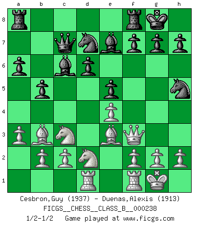 Last move : 1/2-1/2 2016 June 22 4:57:12 [Event "FICGS__CHESS__CLASS_B__000238"] [Site "FICGS"] [Date "2016.02.14"] [Round "1"] [White "Cesbron,Guy"] [Black "Duenas,Alexis"] [Result "1/2-1/2"] [WhiteElo "1937"] [BlackElo "1913"] 1.e4 c5 2.Nf3 d6 3.d4 cxd4 4.Nxd4 Nf6 5.Nc3 a6 6.Bc4 e6 7.O-O b5 8.Bb3 Be7 9.Qf3 Qc7 10.Qg3 O-O 11.Bh6 Ne8 12.Rad1 Bd7 13.Nf3 Bc6 14.a3 Nd7 15.Bf4 e5 16.Be3 Nef6 17.Nd2 Nh5 18.Qf3 Nhf6 19.Qg3 Nh5 20.Qf3 1/2-1/2 Sicilian : Najdorf, Lipnitzky attack Kingside Castling by player White (move 7) Kingside Castling by player Black (move 10) This chess game ended in a draw. Follow this game move after move (download)On the chessboard, lies and hypocrisy do not survive long. (Emanuel Lasker) Wir können eben der zündenden Macht des Opfers nicht wiederstehen, denn die Begeisterung für das Opfer liegt in der Natur des Menschen. (Rudolf Spielmann) Realmente no sabemos como el juego fue inventado, aunque hay sospechas. Tan pronto como descubramos a los culpables, se los haremos saber. (Bruce Pandolfini) Je crois qu'il existe des manières très spécifiques de jouer efficacement contre une machine. Evidemment, nous n'avons aucune chance en technique pure, parce que l'ordinateur calcule de manière parfaite. Mais lorsque nous faisons appel à notre cerveau, en utilisant l'intuition et la compréhension, alors nous restons beaucoup plus forts. (Anatoli Karpov) 'preceded by its own quotation yields a falsehood' preceded by its own quotation yields a falsehood. (W. V. O. Quine - Set Theory And Its Logic, 1953)