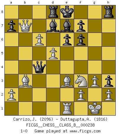 Last move : 1-0 2016 March 30 20:16:24 [Event "FICGS__CHESS__CLASS_B__000238"] [Site "FICGS"] [Date "2016.02.14"] [Round "1"] [White "Carrizo,Jose"] [Black "Duttagupta,Aniruddha"] [Result "1-0"] [WhiteElo "2096"] [BlackElo "1816"] 1.e4 c6 2.d4 d5 3.Nc3 dxe4 4.Nxe4 Nf6 5.Nxf6+ gxf6 6.c3 Qd5 7.Be3 h5 8.Nf3 Bf5 9.Be2 h4 10.O-O h3 11.g3 Bg4 12.c4 Qe4 13.Rc1 Na6 14.d5 c5 15.Qa4+ Bd7 16.Qa5 Nb4 17.Qc7 Nc2 18.Qxb7 Rc8 19.Rxc2 Qxc2 20.Re1 e6 21.b4 Qa4 22.bxc5 Be7 23.c6 Rd8 24.Bd1 Qxc4 25.Bb3 1-0 Caro-Kann : Bronstein-Larsen variation Kingside Castling by player White (move 10) Player White won this chess game. Follow this game move after move (download)Look at Garry Kasparov. After he loses, invariably he wins the next game. He just kills the next guy. That's something that we have to learn to be able to do. (Maurice Ashley) Du weisst es gibt ein Problem mit Computern und Fernschach, wenn jeder eine Rating von 2450 hat. (John Christen Knudsen) La pasion por jugar al Ajedrez es una de las mas inexplicables en el mundo. (H.G. Wells) Des combinaisons [dans le jeu d'échecs] pareilles à des mélodies. Je crois entendre pour ainsi dire la musique des coups... (Vladimir Nabokov) There is no vagueness without wind. (Chinese proverb)