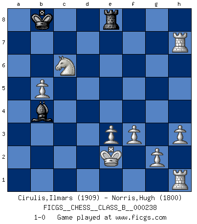 Last move : 1-0 2016 April 15 13:58:21 [Event "FICGS__CHESS__CLASS_B__000238"] [Site "FICGS"] [Date "2016.02.14"] [Round "1"] [White "Cirulis,Ilmars"] [Black "Norris,Hugh"] [Result "1-0"] [WhiteElo "1909"] [BlackElo "1800"] 1.b4 e5 2.a3 d5 3.e3 Nc6 4.Bb2 Nf6 5.b5 Nb8 6.Bxe5 Ne4 7.Nf3 Bg4 8.h3 Qh4 9.Nxh4 Bxd1 10.d3 Bxc2 11.dxe4 Bxe4 12.Nc3 f6 13.Bg3 Nd7 14.f3 Bc2 15.Nxd5 O-O-O 16.Bxc7 Re8 17.Rc1 Bb3 18.Bc4 Bxc4 19.Rxc4 b6 20.Bxb6 Kb8 21.Bxa7+ Kxa7 22.Rc7+ Kb8 23.Rxd7 Bxa3 24.Rxg7 Bd6 25.Nf5 Bc5 26.Nxf6 Ba3 27.Nxe8 Rxe8 28.Rxh7 Bb4+ 29.Ke2 Rd8 30.Nd4 Re8 31.Nc6+ 1-0 Polish (Sokolsky) opening Queenside Castling by player Black (move 15) Player White won this chess game. Follow this game move after move (download)What is the difference between chess and football? Everybody understands football, but nobody plays it. Everybody plays chess, but nobody understands it. Everything is relative. (Vladimir Kramnik) Wenn Capablanka heute auf der Schachbühne erscheinen würde, hätte er ein halbes Jahr gebraucht um sich die Schachtheorie anzueignen. Und dann hätte er alles und jeden besiegt. (Mikhail Moiseyevich Botvinik) El Ajedrez es sobre todo, ¡una pelea!. (Emanuel Lasker) Roi des jeux et jeu des rois, les échecs portent en eux un sentiment d'infini. Ils donnent à celui qui s'est efforcé d'en approfondir les arcanes l'impression de n'être pas à la mesure de l'homme; en fait, ils constituent un résumé de l'univers, un microcosme, et figurent cette grande échelle qui, dans les plans de la lumière descend jusqu'à la matière, qui des abîmes insondables remonte jusqu'en l'infini de Dieu. (Pyrame) A good programmer is someone who always looks both ways before crossing a one-way street. (Doug Linder)