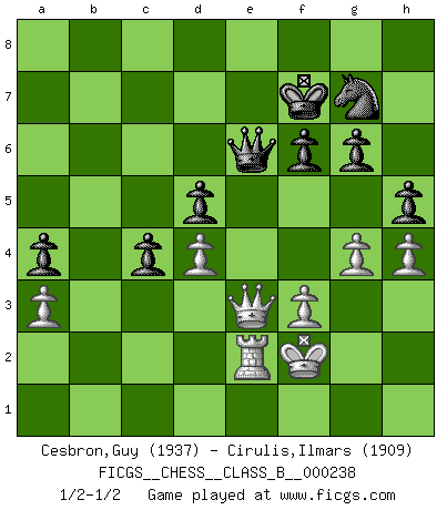 Last move : 1/2-1/2 2016 August 28 11:24:30 [Event "FICGS__CHESS__CLASS_B__000238"] [Site "FICGS"] [Date "2016.02.14"] [Round "1"] [White "Cesbron,Guy"] [Black "Cirulis,Ilmars"] [Result "1/2-1/2"] [WhiteElo "1937"] [BlackElo "1909"] 1.d4 a6 2.c4 e6 3.Nf3 d5 4.cxd5 exd5 5.Nc3 Bb4 6.Bf4 Nf6 7.e3 O-O 8.Bd3 c5 9.dxc5 Nbd7 10.c6 bxc6 11.Nd4 Bb7 12.O-O Re8 13.a3 Bf8 14.b4 a5 15.b5 c5 16.Nc6 Qc8 17.Bc2 Bxc6 18.bxc6 Qxc6 19.Ba4 Qe6 20.Nb5 Rec8 21.Nc7 Rxc7 22.Bxc7 c4 23.Bc2 Qc6 24.Bg3 a4 25.h3 Nc5 26.Be5 Nfe4 27.Ra2 g6 28.Ba1 Be7 29.Bxe4 Nxe4 30.f3 Ng3 31.Qd4 f6 32.Rd1 Rd8 33.Qd2 Bc5 34.Bd4 Bxd4 35.exd4 Re8 36.Re1 Rxe1+ 37.Qxe1 Qb7 38.Rd2 Qb8 39.Rd1 Nf5 40.g4 Ng7 41.Kg2 Qb2+ 42.Qd2 Qb3 43.Re1 h5 44.Qf4 Qb2+ 45.Kg1 Qb6 46.h4 Kf8 47.Re2 Kg8 48.Kg2 Kf7 49.Qe3 Qe6 50.Kf2 1/2-1/2 Queen's pawn Kingside Castling by player Black (move 7) Kingside Castling by player White (move 12) This chess game ended in a draw. Follow this game move after move (download)You cannot play at Chess if you are kind-hearted. (French Proverb) Korrekt heißt in Deutschland die Haltung eines Mannes, dessen Benehmen nach dem Urteile seiner Nachbarn seiner Stellung angemessen ist. Um korrekt zu sein, muß man sich der Meinung der anderen anpassen... (Emanuel Lasker) Fischer sacrificó virtualmente todo lo que la mayoría de nosotros los 'debiles' (término que él usa) valoramos, respetamos y apreciamos por el amor de un astuto, a menudo hermoso tablero de juego, por el privilegio ambivalente de ser su mas grande maestro. (Paul Kollar) Il s'avisa de me proposer d'apprendre les échecs qu'il jouait un peu... me voilà forcené des échecs. J'achète un échiquier, je m'enferme dans ma chambre, j'y passe des jours et des nuits à vouloir apprendre par cur toutes les parties. (Jean-Jacques Rousseau, Confessions) Follow your passion, and success will follow you. (Arthur Buddhold)