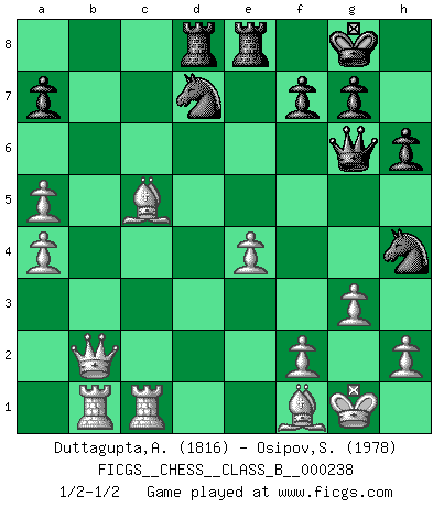 Last move : 1/2-1/2 2016 March 19 11:55:38 [Event "FICGS__CHESS__CLASS_B__000238"] [Site "FICGS"] [Date "2016.02.14"] [Round "1"] [White "Duttagupta,Aniruddha"] [Black "Osipov,Sergey"] [Result "1/2-1/2"] [WhiteElo "1816"] [BlackElo "1978"] 1.c4 Nf6 2.g3 e6 3.Bg2 d5 4.Nf3 dxc4 5.Na3 Bxa3 6.bxa3 O-O 7.Bb2 c5 8.Qc2 Nbd7 9.O-O Qc7 10.a4 Rd8 11.Rfd1 b6 12.Qxc4 Bb7 13.d3 Bc6 14.e4 Re8 15.Qc2 e5 16.Rab1 Rad8 17.Rdc1 h6 18.Bc3 Nh7 19.a5 b5 20.Bd2 Nhf8 21.d4 exd4 22.Nxd4 Ne6 23.Nxc6 Qxc6 24.a4 b4 25.Bxb4 Nd4 26.Qb2 Qa6 27.Bf1 Qg6 28.Bxc5 Nf3+ 29.Kg2 Nh4+ 30.Kg1 Nf3+ 31.Kg2 Nh4+ 32.Kg1 1/2-1/2 English, 1...Nf6 (Anglo-Indian defense) Kingside Castling by player Black (move 6) Kingside Castling by player White (move 9) This chess game ended in a draw. Follow this game move after move (download)When you see a good move, look for a better one. (Emanuel Lasker) Auf Remis zu spielen ist gewissermaßen ein Verbrechen gegen das Schachspiel. (Mikhail Nekhemyevich Tal) a manera como él juega al Ajedrez, demuestra la completa naturaleza de un hombre. (Stanley Ellin) Il n'y a pas de prix trop élevé au scalp de l'ennemi. (Koblentz) The message for business people contemplating their place in the cyberspace is simple and direct: get linked or get lost. (Vic Sussman and Kenan Pollack)