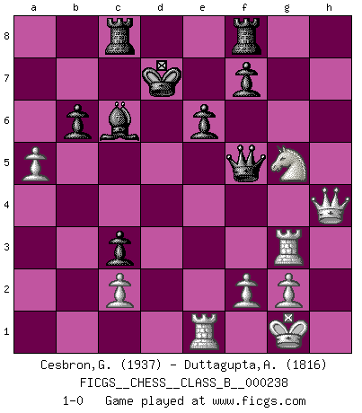 Last move : 1-0 2016 July 15 15:51:34 [Event "FICGS__CHESS__CLASS_B__000238"] [Site "FICGS"] [Date "2016.02.14"] [Round "1"] [White "Cesbron,Guy"] [Black "Duttagupta,Aniruddha"] [Result "1-0"] [WhiteElo "1937"] [BlackElo "1816"] 1.e4 e6 2.d4 d5 3.Nc3 Nf6 4.Bg5 Bb4 5.e5 h6 6.Be3 Ne4 7.Qg4 g6 8.a3 Bxc3+ 9.bxc3 c5 10.Bd3 h5 11.Qf3 Nxc3 12.dxc5 d4 13.Bd2 Nc6 14.Bxc3 dxc3 15.Qe3 Qc7 16.Nf3 Ne7 17.Ng5 O-O 18.O-O b6 19.Be4 Nd5 20.Qg3 Bb7 21.Rfd1 Rae8 22.Bf3 Ne7 23.Bxh5 Nf5 24.Qh3 Kg7 25.Bg4 Qxe5 26.Qh7+ Kf6 27.Bxf5 Qxf5 28.h4 Bd5 29.cxb6 axb6 30.Rd3 Rc8 31.Re1 Qg4 32.Rg3 Qf5 33.h5 gxh5 34.a4 Bc6 35.Qxh5 Ke7 36.Qh4 Kd7 37.a5 1-0 French : MacCutcheon, Janowski variation Kingside Castling by player Black (move 17) Kingside Castling by player White (move 18) Player White won this chess game. Follow this game move after move (download)A thorough understanding of the typical mating continuations makes the most complicated sacrificial combinations leading up to them not only not difficult, but almost a matter of course. (Siegbert Tarrasch) Es ist besser die Steine des Gegners zu opfern. (Savielly Grigorievitsch Tartakower) Aún el Rey más flojo huye despavorido ante la amenaza de un Jaque doble. (Aaron Nimzowitsch) Le génie consiste à savoir transgresser les règles au moment opportun. (Teichmann) Nobody is always a winner, and anybody who says he is, is either a liar or doesn't play poker. (Amarillo Slim)