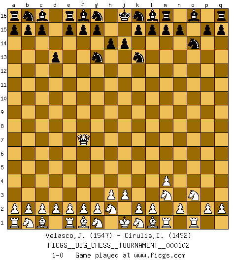 Last move : 1-0 2016 February 15 16:2:1 [Event "FICGS__BIG_CHESS__TOURNAMENT__000102"] [Site "FICGS"] [Date "2016.02.15"] [Round "1"] [White "Velasco,Jose Maria"] [Black "Cirulis,Ilmars"] [Result "1-0"] [WhiteElo "1547"] [BlackElo "1492"] 1.j2-k4 j15-k13 2.h1-o7 h15-g13 3.o7-o15 p16-o14 4.o15-f7 h16-o10 5.m2-m4 o10-o2 6.p1-o3 d15-d13 7.k4-m3 o2-o1 8.q1-o1 1-0 Follow this game move after move (download)I play correspondence chess because it is both art and science while chess is art only. (A player at FICGS) Die starken Figuren des Gegners muss man abtauschen. (José Raúl Capablanca) El jugador de combinación piensa hacia adelante; comienza de la posición dada y trabaja las movidas contundentes en su mente. (Emanuel Lasker) Botvinnik disait en comparant les échecs à la musique: Il existe une science dont le but est l'étude de l'acoustique et des sons. Mais il y a aussi un art qui se sert de l'océan des sons : c'est la musique. De toute évidence, il en est de même pour la pensée. La logique est l'étude des lois de la réflexion et les échecs reflètent, en tant qu'art, le côté logique de la réflexion, sous la forme d'images artistiques... Extrait de Fischer - Spassky, Reykjavik 1972 par Alexander & F. Wyndham (Ed. Solar), p 37. The hypothalamus is one of the most important parts of the brain, involved in many kinds of motivation, among other functions. The hypothalamus controls the 'Four Fs: Fighting, Fleeing, Feeding and Mating. (Unknown author)