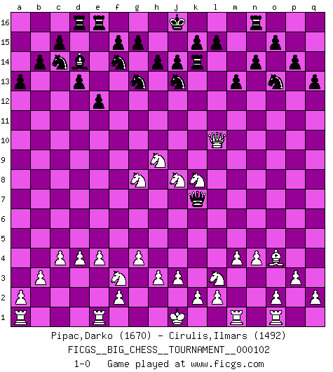 Last move : 1-0 2016 February 15 22:44:24 [Event "FICGS__BIG_CHESS__TOURNAMENT__000102"] [Site "FICGS"] [Date "2016.02.15"] [Round "1"] [White "Pipac,Darko"] [Black "Cirulis,Ilmars"] [Result "1-0"] [WhiteElo "1670"] [BlackElo "1492"] 1.j2-k4 j15-k13 2.h2-g4 h15-g13 3.g1-f3 g16-f14 4.d2-d4 q15-q13 5.e2-e4 p15-p14 6.k1-l3 a15-a13 7.b2-b3 b15-b14 8.p2-p3 c16-b15 9.n2-n4 m15-m14 10.m2-m4 o16-q14 11.c1-q14 p16-q14 12.l1-o4 e15-e13 13.h1-n6 q14-o13 14.f1-c4 m14-m13 15.b1-c3 q16-n16 16.c3-d5 n15-n14 17.d5-f6 f16-c13 18.k4-h5 k16-l14 19.g4-h6 b15-a14 20.p1-o3 a14-o1 21.q1-o1 l16-m15 22.o3-n5 b16-c14 23.n5-l6 d15-d13 24.h5-j7 c13-d14 25.f6-g8 a16-d16 26.l6-k8 e13-e12 27.j7-h9 h16-o10 28.g2-g3 l14-j13 29.c4-b5 k13-m12 30.b5-m15 m16-m15 31.c2-c4 m12-l10 32.n6-k3 m15-m14 33.h6-j8 m14-k14 34.k3-c10 o10-n10 35.g3-g4 n10-k7 36.c10-l10 1-0 Follow this game move after move (download)I have never in my life played the French Defence, which is the dullest of all openings. (Wilhelm Steinitz) Jeder leidlich begabte Spieler, er braucht keineswegs hervorragend veranlagt zu sein, kann es zum Meister bringen. Aber das ist ja auch gar nicht nötig! Der richtige Standpunkt ist es, zu seinem Vergnügen zu spielen, und man glaube ja nicht, dass der Genuss proportional dem Können sei. (Siegbert Tarrasch) Yo nunca en mi vida he jugado la Defensa Francesa, que viene siendo la más aburrida de todas las Aperturas. (Wilhelm Steinitz) Nous sommes les pions de la mystérieuse partie d'Echecs jouée par Dieu. Il nous déplace, nous arrête, nous pousse encore, puis nous lance un à un dans la boîte du Néant. Epitaphe sur la tombe de David Janowsky (1868-1927). Methinks King Thibault should dub Marius Zubac a knight of the square board... I mean table, henceforth addressing him as Sir Marius, and bestow on him a suitable land from the kingdom of FICGS & marry him off to a worthy, fair maiden, lest he slice our heads with his mighty sword in his wrath. (Dinesh De Silva)