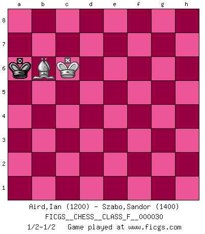 Last move : 1/2-1/2 2007 December 11 17:53:27 [Event "FICGS__CHESS__CLASS_F__000030"] [Site "FICGS"] [Date "2007.03.20"] [Round "1"] [White "Aird,Ian"] [Black "Szabo,Sandor"] [Result "1/2-1/2"] [WhiteElo "1200"] [BlackElo "1400"] 1.e4 d5 2.exd5 Nf6 3.d4 Nxd5 4.c4 Nf6 5.Nf3 Bg4 6.Be2 c6 7.O-O e6 8.Nc3 Be7 9.h3 Bh5 10.Be3 O-O 11.Qb3 Qc7 12.g4 Bg6 13.Ne5 Nbd7 14.Nxg6 hxg6 15.Rae1 Nh7 16.f4 g5 17.Bd3 gxf4 18.Bxf4 Bd6 19.Be3 Rad8 20.Qc2 Nhf6 21.Qg2 c5 22.Nb5 Qb8 23.g5 Nh5 24.Nxd6 Qxd6 25.Qg4 g6 26.Bc2 Qg3+ 27.Qxg3 Nxg3 28.Rf4 Nf5 29.Bxf5 exf5 30.dxc5 Ne5 31.Ref1 Rd3 32.Bd4 f6 33.gxf6 Nxc4 34.R1f3 Rxf3 35.Rxf3 Rd8 36.Bc3 Kf7 37.Rf4 Nd2 38.Ra4 a6 39.c6 bxc6 40.Rxa6 Ne4 41.Ra7+ Kf8 42.Bb4+ c5 43.Ba3 Rd1+ 44.Kg2 Rd3 45.Rc7 Rd2+ 46.Kf3 Rd3+ 47.Kf4 Rxh3 48.Ra7 Rd3 49.b4 Rd5 50.bxc5 g5+ 51.Kf3 Nxf6 52.c6 Ke8 53.Rb7 Rd3+ 54.Ke2 Rc3 55.Rb8+ Kf7 56.Rf8+ Kg7 57.Rxf6 Kxf6 58.Bb2 Ke5 59.Bxc3+ Kd6 60.Be5+ Kxc6 61.Kf3 f4 62.Bf6 g4+ 63.Kxf4 g3 64.Kxg3 Kb7 65.Kf4 Ka7 66.Ke4 Ka8 67.Kd5 Ka7 68.Kc6 Ka8 69.a4 Ka7 70.a5 Ka8 71.a6 Ka7 72.Bd8 Kxa6 73.Bb6 1/2-1/2 Scandinavian : Marshall variation Kingside Castling by player White (move 7) Kingside Castling by player Black (move 10) 10 pieces endgame at move 51 : White KRBPP , Black KRNPP WHITE : King + 1 Rook 1 Bishop 2 Pawns BLACK : King + 1 Rook 1 Knight 2 Pawns 9 pieces endgame at move 57 : White KRBPP , Black KRPP WHITE : King + 1 Rook 1 Bishop 2 Pawns BLACK : King + 1 Rook 2 Pawns 8 pieces endgame at move 57 : White KBPP , Black KRPP WHITE : King + 1 Bishop 2 Pawns BLACK : King + 1 Rook 2 Pawns 7 pieces endgame at move 59 : White KBPP , Black KPP WHITE : King + 1 Bishop 2 Pawns BLACK : King + 2 Pawns 6 pieces endgame at move 60 : White KBP , Black KPP WHITE : King + 1 Bishop 1 Pawn BLACK : King + 2 Pawns 5 pieces endgame at move 63 : White KBP , Black KP WHITE : King + 1 Bishop 1 Pawn BLACK : King + 1 Pawn 4 pieces endgame at move 64 : White KBP , Black K WHITE : King + 1 Bishop 1 Pawn BLACK : King + 3 pieces endgame at move 72 : White KB , Black K WHITE : King + 1 Bishop BLACK : King + This chess game ended in a draw. Follow this game move after move (download)In a gambit you give up a Pawn for the sake of getting a lost game. (Samuel Standige Boden) Kritik überlasse ich den Spießern. Ich zeige nichts, wofür ich mich schämen muss. (Alexandra Kosteniuk) El Peón aislado arroja penumbra sobre todo el tablero. (Aaron Nimzovich) Demandez au pauvre Cg1 ce qu'il en pense. Eduard Gufeld à propos de la variante Saemisch de l'Est-Indienne. Winning isn't everything... but losing is nothing. (Mednis)