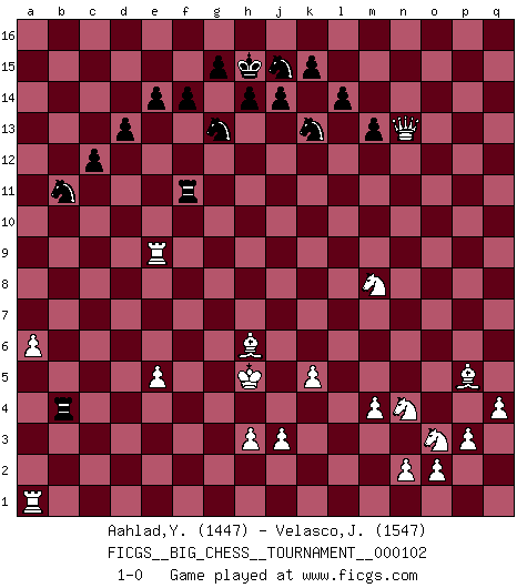 Last move : 1-0 2016 July 1 23:36:54 [Event "FICGS__BIG_CHESS__TOURNAMENT__000102"] [Site "FICGS"] [Date "2016.02.15"] [Round "1"] [White "Aahlad,Yeturu"] [Black "Velasco,Jose Maria"] [Result "1-0"] [WhiteElo "1447"] [BlackElo "1547"] 1.e2-e4 j15-k13 2.m2-m4 n15-n13 3.p2-p3 m15-m13 4.o1-p2 h16-o10 5.m1-m3 o10-f2 6.g1-f3 l16-p12 7.e1-e3 f2-o10 8.m3-o3 o10-c10 9.j2-k4 d15-d13 10.h1-o7 h15-g13 11.f1-b5 g16-j15 12.l1-p5 k16-h15 13.o3-o5 c16-o5 14.o7-o5 e15-e14 15.p2-g10 o16-d6 16.e4-e5 d6-f8 17.c2-c4 f16-b12 18.l2-l3 l15-l14 19.o5-o15 p15-p14 20.o15-o7 m16-o16 21.o7-p7 p12-m9 22.p1-o3 c10-e10 23.g10-f9 e10-n10 24.p7-n5 c15-c13 25.n5-c15 b16-c14 26.c15-b15 e16-c16 27.k1-m2 p16-n15 28.d2-d4 m9-k7 29.c4-c5 o16-o11 30.b15-a14 c13-c12 31.a14-a8 f15-f14 32.b1-c3 q16-o16 33.f3-h4 o11-o8 34.a8-b7 a16-b16 35.b7-f7 o8-o7 36.f7-j4 n10-p12 37.q2-q4 k7-h5 38.j4-h5 p12-n12 39.h4-g6 f8-e9 40.c3-d5 n12-d12 41.g6-e7 b12-a11 42.h2-f3 a11-e7 43.d5-e7 o7-e7 44.h5-h10 e7-o7 45.h10-n15 d12-g12 46.f3-h4 g12-d12 47.n15-q15 d12-d4 48.q15-p14 d4-c5 49.j1-j2 b16-b5 50.f9-b5 c5-b5 51.k4-l6 c16-b16 52.a2-a4 b5-a6 53.l6-m8 o7-o13 54.q1-d1 a6-e10 55.l3-l4 b16-b11 56.d1-d6 c14-a13 57.d6-e6 e10-d9 58.p14-p9 g13-f11 59.e3-f3 h15-g13 60.c1-h6 b11-b9 61.f3-f9 d9-d5 62.f9-e9 f11-e9 63.e6-e9 b9-b2 64.m2-n4 o13-o11 65.p9-g9 a13-b11 66.g9-a15 j16-h15 67.a15-h8 o11-h11 68.h8-g7 o16-o11 69.a4-a5 h11-f11 70.a5-a6 o11-g11 71.g7-n13 g11-g2 72.h4-g2 d5-g2 73.j2-k3 g2-k2 74.k3-j4 b2-b4 75.j4-h5 k2-k5 76.l4-k5 1-0 Follow this game move after move (download)In Chess, as it is played by masters, chance is practically eliminated. (Emanuel Lasker) Ich moechte nie einem Club beitreten, der Leute wie mich als Mitglieder aufnimmt. (Woody Allen) La maestría del Ajedrez consiste esencialmente en analizar posiciónes de Ajedrez con precisión. (Mikhail Botvinnik) Aux échecs, l'amour-propre est satisfait quand on remporte la victoire, mais il n'y a pas de honte à être battu. (Benjamin Franklin) Wisdom begins at the end. (Daniel Webster)