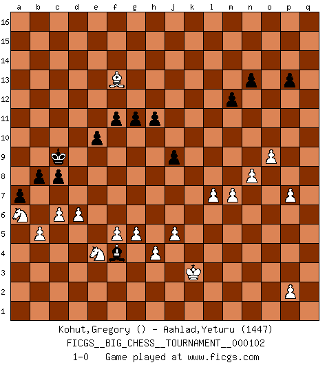 Last move : 1-0 2017 July 13 8:53:27 [Event "FICGS__BIG_CHESS__TOURNAMENT__000102"] [Site "FICGS"] [Date "2016.02.15"] [Round "1"] [White "Kohut,Gregory"] [Black "Aahlad,Yeturu"] [Result "1-0"] [WhiteElo ""] [BlackElo "1447"] 1.e2-e4 e15-e13 2.j2-k4 m15-m13 3.d2-d3 j15-k13 4.m2-m4 h16-o10 5.g2-g3 l16-p12 6.b1-c3 b15-b14 7.c1-d2 c16-b15 8.h1-p8 o15-o13 9.p1-o3 f16-b12 10.l1-m2 p16-o14 11.g1-j2 n15-n13 12.j2-h4 e16-e14 13.h2-j4 c15-c13 14.f1-e2 p12-e2 15.e1-e2 b15-k7 16.g3-g4 e14-g14 17.k1-h2 o16-d6 18.f2-f4 o14-p12 19.p8-q7 k7-h9 20.q7-m3 g16-f14 21.n2-n4 d15-d13 22.o1-n2 m16-m14 23.h4-j2 b16-c14 24.m2-n3 k16-l14 25.m4-m5 q15-q13 26.n3-k6 o10-b10 27.a1-b1 c13-c12 28.m3-h7 k13-j11 29.h7-o13 m13-m12 30.o13-o6 f14-g12 31.o6-m4 m14-o14 32.q1-n1 g12-h10 33.o3-m2 q16-o16 34.o2-o3 o14-o7 35.m2-k3 o16-o8 36.k3-h4 j16-j15 37.h4-f5 d6-f8 38.k6-h4 b10-b9 39.h2-k3 a16-o16 40.d2-e1 o8-p8 41.n2-o1 o7-q7 42.q2-q3 o16-o7 43.h4-j5 p8-n8 44.j5-f8 n8-f8 45.m1-l1 g14-g11 46.e1-d2 c14-d12 47.n1-m1 h15-g13 48.m4-n3 b12-d10 49.d2-e3 f8-c8 50.a2-a3 g13-h11 51.k3-h4 l14-k12 52.j1-h2 c8-p8 53.c3-d5 p12-n11 54.c2-c4 d10-e11 55.n3-m2 h11-j9 56.e3-b6 g11-f11 57.b6-l15 k12-m11 58.l15-a5 j11-k9 59.a5-c3 n11-l10 60.l2-l3 m11-n9 61.b1-f1 o7-o6 62.m2-l2 h9-f7 63.j2-g3 f15-f13 64.k2-k3 e11-d10 65.k4-l6 f7-g8 66.l3-l4 a15-a13 67.m1-m2 g15-g13 68.m2-n2 a13-a12 69.n4-n5 o6-o4 70.n2-n4 o4-o8 71.n4-p4 q7-q11 72.p4-p8 o8-p8 73.g3-j2 f11-o11 74.j2-l3 b14-b13 75.l1-n1 g8-j10 76.e2-e1 k9-l7 77.n1-m1 j9-k7 78.l3-k5 h10-j8 79.f5-g3 d12-e10 80.k3-k4 e10-d8 81.k5-l7 j8-l7 82.l2-j2 j10-f7 83.m1-n1 k15-k13 84.f1-m1 n9-l8 85.l6-m4 l8-j7 86.m1-m2 q11-q6 87.m4-k3 l10-k8 88.j2-k1 k8-h7 89.k3-l5 k7-h8 90.m2-m4 p15-p13 91.n1-n4 h14-h13 92.n4-q4 b9-q9 93.q4-q6 q9-q6 94.k1-l1 q6-q8 95.m4-n4 f7-j10 96.n5-n6 d10-f12 97.h2-j2 d8-f7 98.l1-n1 o11-o8 99.n4-q4 q8-p9 100.q4-q13 p8-q8 101.q13-q8 o8-q8 102.e1-m1 b13-b12 103.l5-k3 d13-d12 104.m1-m4 l7-m9 105.n1-n3 b12-b11 106.m4-p4 q8-p8 107.n3-j7 h7-g9 108.c3-h8 f7-h8 109.j7-h8 p8-p4 110.q3-p4 m9-l11 111.h8-o2 p9-q9 112.o3-o4 f12-e11 113.o2-n2 g9-e8 114.o4-o5 j10-d5 115.c4-d5 q9-b9 116.j2-k1 b9-b3 117.n2-d2 a12-a11 118.l4-l5 d12-d11 119.k3-j5 e13-e12 120.j4-g5 e11-f10 121.o5-o6 c12-c11 122.o1-n2 j14-j13 123.n2-o3 j13-j12 124.g3-h5 h13-h12 125.o6-o7 h12-h11 126.m5-m6 a11-a10 127.n6-n7 b11-b10 128.o7-o8 a10-a9 129.g5-e6 b3-b7 130.k1-k2 a9-a8 131.d2-c3 c11-c10 132.j5-g6 b10-b9 133.b2-b4 f10-e11 134.g6-e5 c10-c9 135.e5-f3 b9-b8 136.c3-c6 b7-c6 137.d5-c6 j15-k14 138.k2-k3 a8-a7 139.k3-l4 d11-d10 140.p4-p5 k14-l13 141.j3-j4 j12-j11 142.a3-a4 j11-j10 143.p5-p6 k13-k12 144.p6-p7 k12-k11 145.h4-k3 k11-k10 146.f3-h4 l13-k12 147.h4-j6 k10-k9 148.k3-m4 k12-j11 149.o3-q5 e11-g9 150.b4-b5 f13-f12 151.o8-o9 j10-j9 152.k4-k5 e12-e11 153.m4-n6 j11-k10 154.l5-l6 k9-k8 155.e6-g7 e8-g7 156.h5-g7 g9-d6 157.f4-f5 d6-h2 158.l4-m5 h2-d6 159.m6-m7 d6-c5 160.q5-o7 l11-j10 161.j6-g5 j10-h8 162.o7-h13 c5-g1 163.n7-n8 g1-j3 164.g5-j6 h8-f7 165.g7-h5 j3-h2 166.d3-d4 h2-g1 167.d4-d5 g1-d4 168.g4-g5 f7-d6 169.h5-f6 d6-c4 170.n6-l5 d4-c3 171.l5-m3 c4-b2 172.m3-k4 b2-a4 173.k4-h5 c3-d4 174.j6-g7 a4-c3 175.h13-a6 k10-j10 176.g7-e6 d4-e3 177.m5-l4 j10-h10 178.l4-k4 h10-g9 179.d5-d6 g9-f9 180.d6-d7 f9-g10 181.k4-k3 f12-f11 182.f6-d5 c3-d5 183.e4-d5 e11-e10 184.h5-f6 d10-d9 185.f6-e4 g10-f9 186.h3-h4 f9-e9 187.a6-b7 g13-g12 188.j4-j5 e9-d10 189.b7-a8 g12-g11 190.k5-k6 c9-c8 191.d7-c8 d9-c8 192.l6-l7 k8-l7 193.k6-l7 d10-c9 194.e6-c5 c9-d8 195.c5-a6 e3-f4 196.d5-d6 d8-c9 197.a8-f13 1-0 Follow this game move after move (download)For me, Chess is life and every game is like a new life. Every Chess player gets to live many lives in one lifetime. (Eduard Gufeld) Das Schachspiel ist ein See, in welchem eine Mücke baden und ein Elefant ertrinken kann. (Emanuel Lasker) El Ajedrez es el gimnasio de la mente. (Blaise Pascal) Horreur, mais aussi harmonie suprême : qu'y avait-il en effet au monde en dehors des échecs ? Le brouillard, l'inconnu, le non-être... (Vladimir Nabokov) True nature is revealed in times of difficulty. (Chinese proverb)
