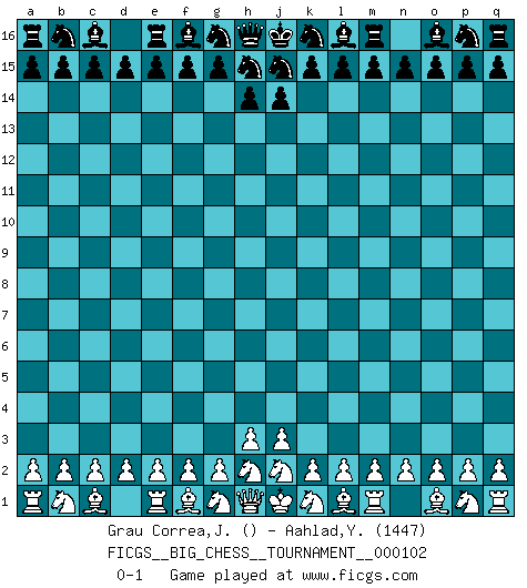 Last move : 0-1 2016 March 16 6:32:0 [Event "FICGS__BIG_CHESS__TOURNAMENT__000102"] [Site "FICGS"] [Date "2016.02.15"] [Round "1"] [White "Grau Correa,Jose Horacio"] [Black "Aahlad,Yeturu"] [Result "0-1"] [WhiteElo ""] [BlackElo "1447"] 0-1 This big chess game has been lost on time (started : 2016.02.15 3:48:52) Follow this game move after move (download)Fischer sacrificed virtually everything most of us weakies (to use his term) value, respect, and cherish, for the sake of an artful, often beautiful board game, for the ambivalent privilege of being its greatest master. (Paul Kollar) Es ist im Leben wie im Schachspiel. Wir entwerfen einen Plan, dieser bleibt jedoch bedingt durch das, was im Schachspiel dem Gegner, im Leben dem Schicksal zu tun belieben wird. (Arthur Schopenhauer) Con el tiempo, empecé a progresar en partidas decisivas. Tal vez porque me di cuenta de una simple verdad: no solo estaba yo nervioso sino también mi oponente. (Mikhail Tal) J'apprécie les joueurs d'est-indienne, c'est grâce à eux que je nourris ma famille depuis tant d'années. (Petrosian) Never risk one's whole fortune unless supported by one's entire army. (Niccolo Machiavelli)