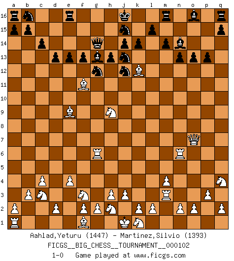 Last move : 1-0 2016 August 10 18:57:46 [Event "FICGS__BIG_CHESS__TOURNAMENT__000102"] [Site "FICGS"] [Date "2016.02.15"] [Round "1"] [White "Aahlad,Yeturu"] [Black "Martinez,Silvio"] [Result "1-0"] [WhiteElo "1447"] [BlackElo "1393"] 1.e2-e4 g15-g13 2.m2-m4 o15-o14 3.p2-p3 n15-n13 4.o1-p2 c15-c14 5.p1-o3 d15-d13 6.l1-p5 h15-j13 7.j2-k4 k16-l14 8.h1-o7 h14-h13 9.p5-g13 f15-f14 10.g13-d10 f16-h14 11.d10-e9 h14-g13 12.k4-l6 g16-h14 13.c2-c4 c16-g12 14.b1-c3 m15-m14 15.e1-e3 l16-n14 16.b2-b3 p16-n15 17.c1-a3 k15-k14 18.m1-m3 g12-e10 19.m3-n3 e10-f11 20.n3-n6 h16-g15 21.e3-g3 h14-g12 22.q1-m1 l14-k12 23.l6-k8 n15-m13 24.o3-q4 p15-p13 25.p2-f11 f14-f13 26.m1-m3 e15-e13 27.g3-g8 m13-l11 28.g1-f3 g15-g14 29.a3-k12 l11-j12 30.k8-h9 o14-o13 31.g8-g6 1-0 This big chess game has been lost on time (started : 2016.02.15 3:48:52) Follow this game move after move (download)It is not a move, even the best move that you must seek, but a realizable plan. (Eugene Znosko-Borovsky) Ich bin stolz ein Bulgare zu sein. (Veselin Topalov) Vive, pierde y aprende al observar a tu oponente como gana. (Amber Steenbock) Une platitude souvent récitée à propos des Echecs est qu'une des choses les plus difficiles à réaliser est de gagner une position gagnante. Cela ne manque pas de sens mais, pour ma part, j'ai toujours trouvé plus difficile de gagner une position perdante. (Tim Krabbe) Unless I accept my faults I will most certainly doubt my virtues. (Hugh Prather)
